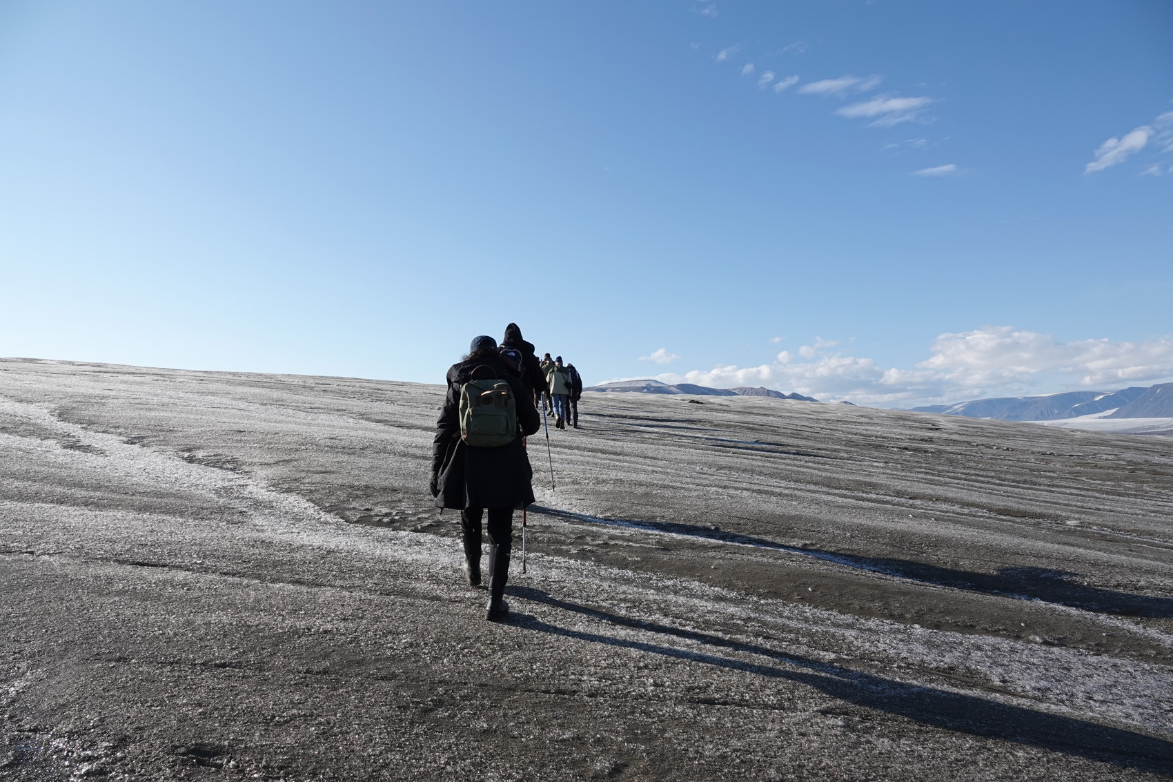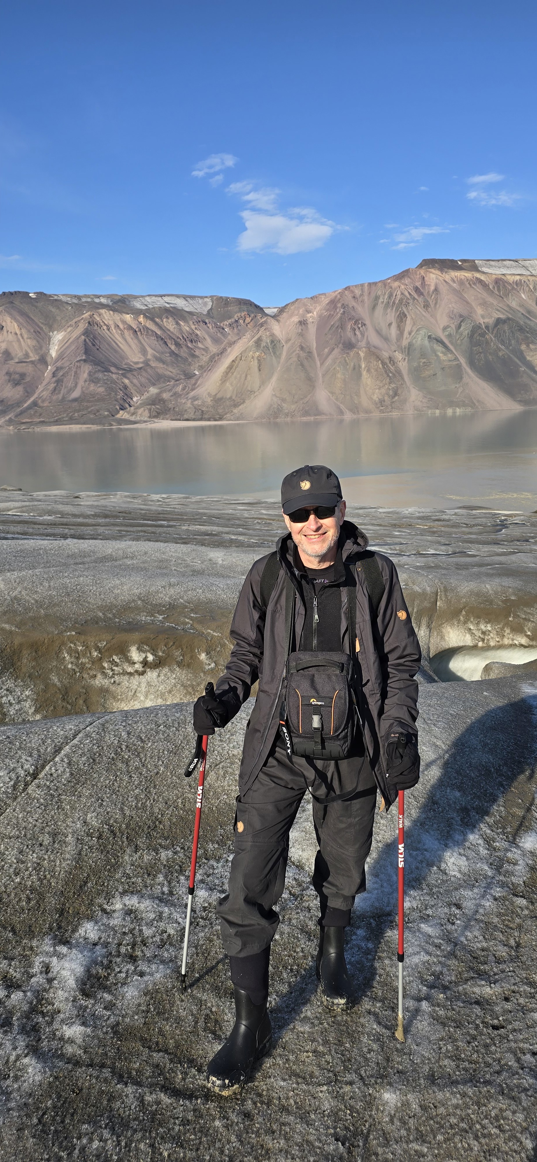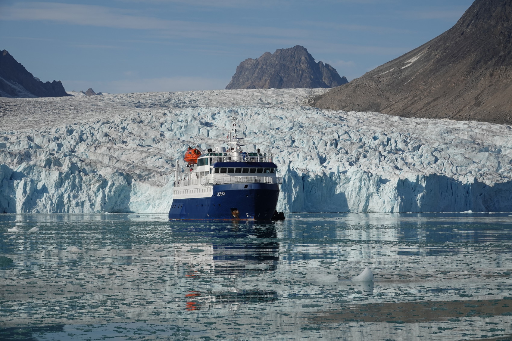 Vädrets makter gjorde det nödvändigt att vara i lä i Hinlopen nästa dag. Våra guider valde att lägga in ett besök i Lomfjorden. Det var morgondis med svag sol när vi seglade in där, det var så vackert. Men sedan tog solen helt över. Vi var ju helt i lä så inne i fjorden var det helt vindstilla och det syntes inte en krusning på vattenytan. En glaciärvandring stod på det nyinsatta programmet här för de som ville och det ville vi! Det var en god idé att använda de vandringsstavar som fanns till låns. Vi gick uppåt på glaciären och fick efterhand en fantastiskt utsikt över fjorden. Quest var bara en liten prick långt borta. Intressant hur den extremt klara luften gör det svårt att bedöma avstånd.