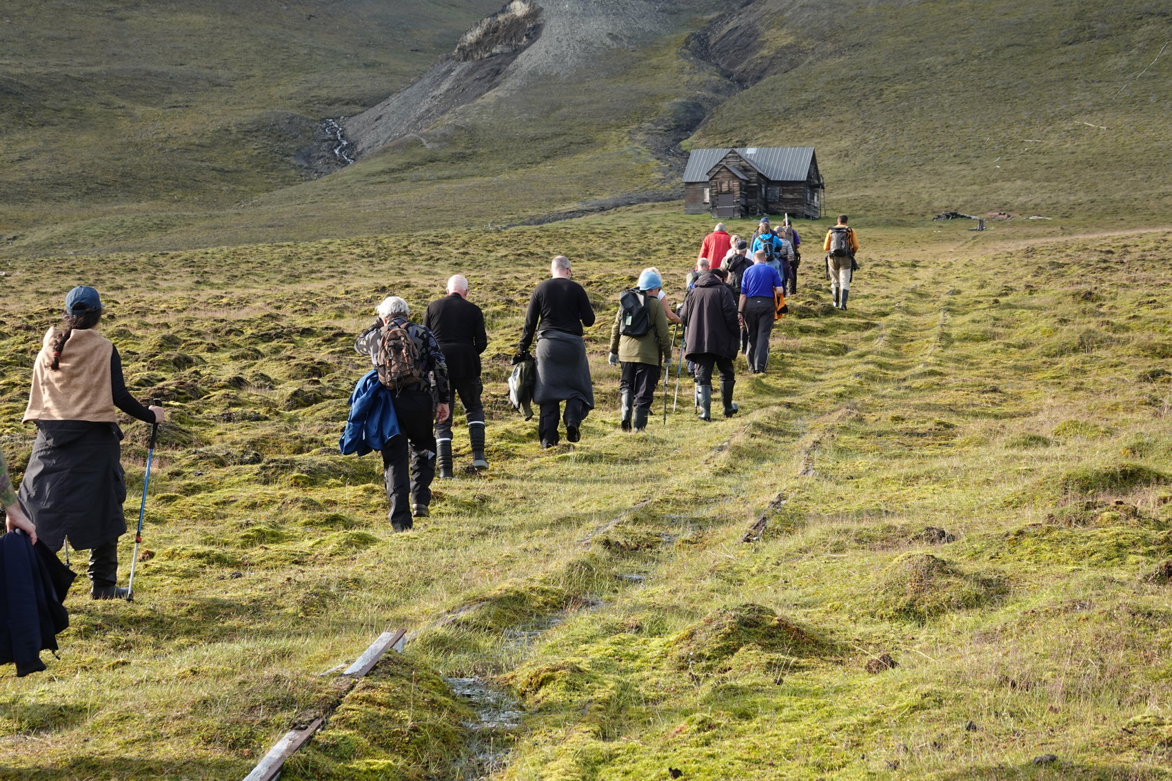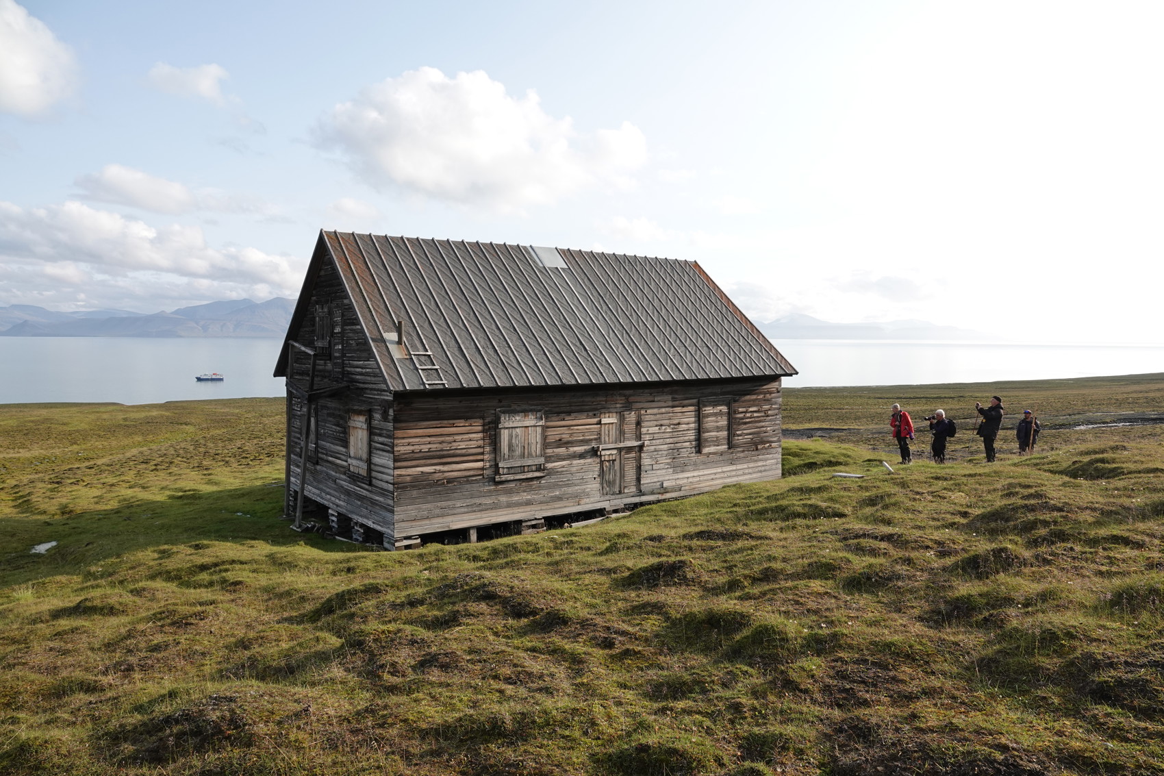 Landstigningen är rätt svår pga dyningarna i fjorden men med guidernas skicklighet så kom vi iland. Där väntade så en mycket brant klättring upp till det plana fältet och en vandring på en knapp kilometer i sank mark upp till huset. Men det var så värt ansträngningen att komma till huset och ännu en gång känna historiens vingslag. Tyvärr finns det en gravplats nära huset där ett antal fångstmän finns begravda - de miste livet pga blyförgiftning har senare undersökningar visat. Nedstigningen till strandkanten efter vandringen tillbaka var en brant upplevelse, det fanns nog någon som ångrade sig just det ögonblicket men som säkert efterföljande tycker att allt var upplevelsen värd.