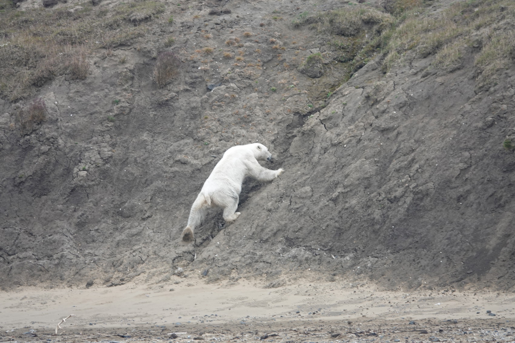På vägen tillbaka till Quest såg vi isbjörnen som vi tidigare skymtat. Vi låg stilla och tyst med zodiacerna, på behörigt avstånd. Efter ett tag reste sig björnen upp, tittade sig runt, sniffade lite och började gå ner mot stranden. Tiden försvann igen. Vilken upplevelse! Väl ombord på Quest igen så såg vi att björnen hade börjat simma över fjorden. Vi följde den en lång stund, kamerorna blev varma igen. Så småningom gick björnen iland och började gå längs stranden. Den nosade på många ting, uträttade sina behov och fortsatte vandringen. De som hade kikare hade god användning av dem. Vi seglade vidare. Vilken dag!