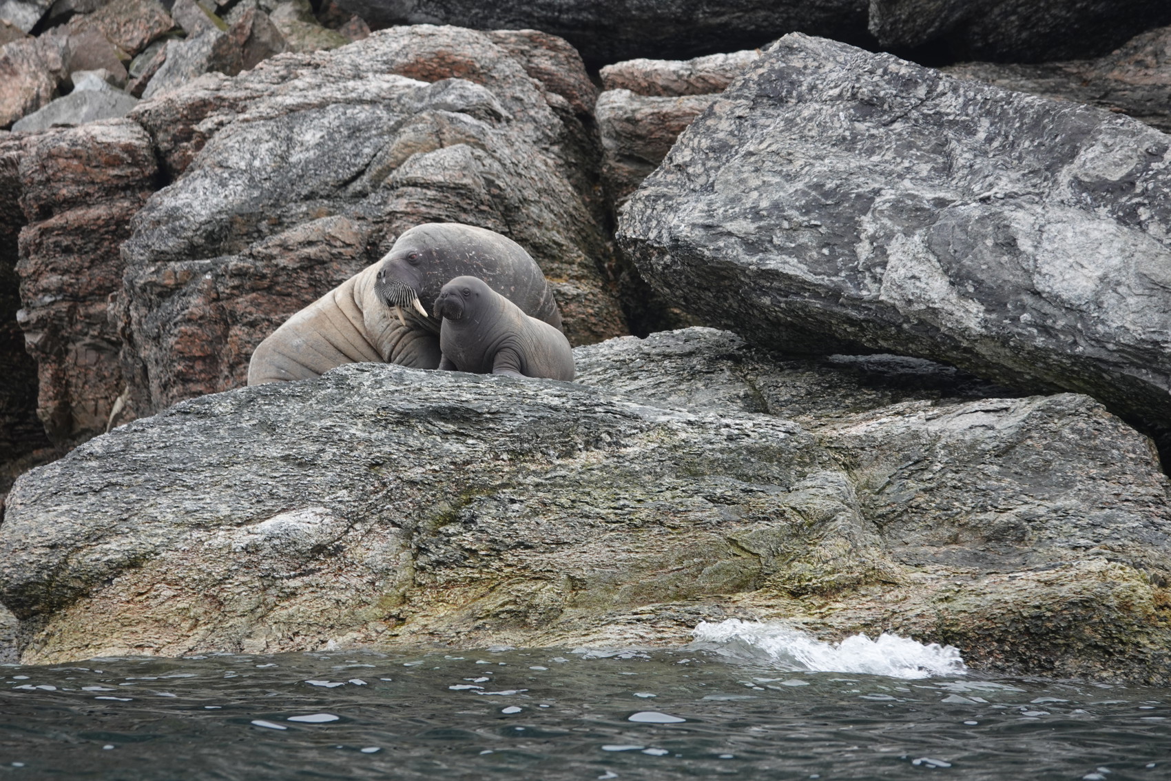 Nästa dag ankrade vi upp vid Nelsonøya. En liten ö i västra delen av Sjuöarna. Innan denna dag kände i alla fall jag inte till denna lilla ö. Ett fågelberg dominerar och det var tänkt att vi skulle göra en landstigning, men det visade sig att en isbjörn hade kommit före oss. Den låg lite högre upp på ön och tittade ner på oss. En valrosskoloni fanns också där och de simmade runt och var nyfikna på oss. Valrossarna kom till att överraska oss alla på resan. De ser stora och otympliga ut på land och det är de, men ack så smidiga och snabba i vattnet. De är nyfikna och närmar sig själva steg för steg som grupp. De simmar närmare, kikar upp och simmar runt på stället och sedan plötsligt ger de sig av. Sedan kommer de närmare igen, närmare än tidigare och så upprepar det sig flera gånger. De är härliga. Efter ett tag såg vi på ena sidan att en valrosshona låg på en klipphäll tillsammans med sin unge. De var rätt väl kamouflerade färgmässigt med klipphällen. De låg där rätt länge för att sedan till slut långsamt glida ner i vattnet, kanske var det lite simövningar på gång för ungen. Det blev en extra fin upplevelse att få se detta.