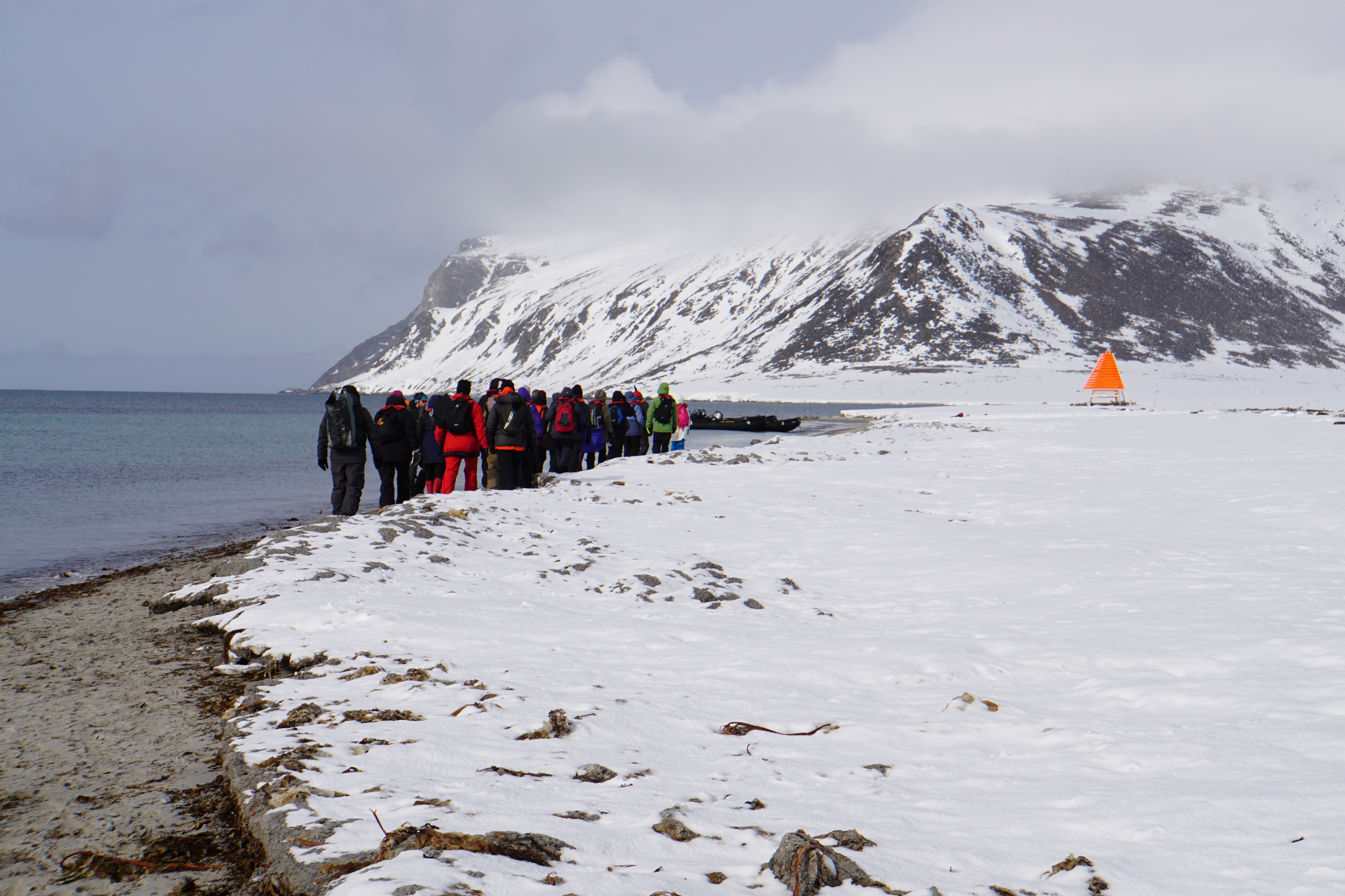 Efter frukost står vi lydigt på led, hela gruppen, på däck två. Alla som deltar har satt sin signatur vid sitt namn på tavlan och är påpälsade till max, med minst tre lager, goretex-skalkläder, vind- och vattentäta vantar och mössor, fodrade gummistövlar och så flytvästar på det. Ingen har haft så här mycket kläder på sig sedan lekis. Ingen vet riktigt vad de kan förvänta sig, men alla är eniga om en sak – nu börjar äventyret. Och det gör det – en dörr har öppnats i sidan på fartyget som leder ner till en landgång där guiderna tar emot oss i gummibåtarna.