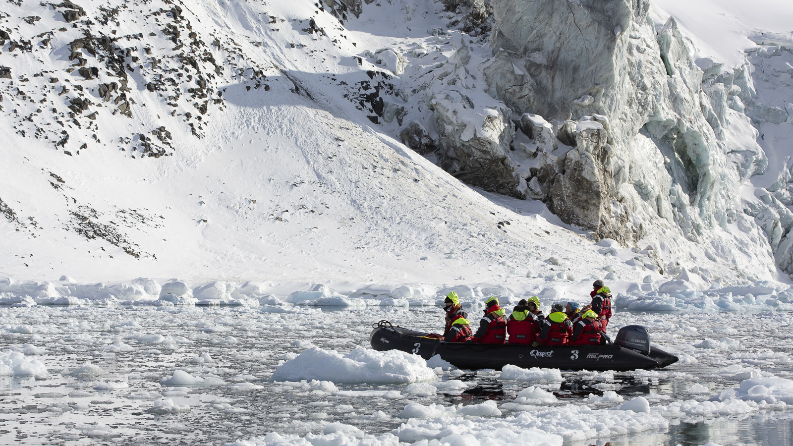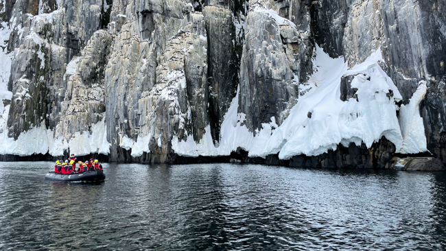 Sent på eftermiddagen korsade vi Hinlopensundet från öst till väst och sjösatte våra Zodiacs för en kryssning som brukar vara en av höjdpunkterna - Alkefjellet, med sina över 100 meter höga klippor. Basaltpelarna som har skurits ut perfekt ur klipporna av erosionen, är hem för mer än 60 000 häckande par av spetsbergsgrisslor och tretåiga måsar.