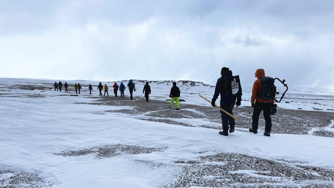 Vi gick på en vandring vid Idunneset, som ligger på den stora ön Nordaustlandet, nordost om Spetsbergen. Det var kyligt, men delvis soligt, och man kunde se så långt ögat nådde.