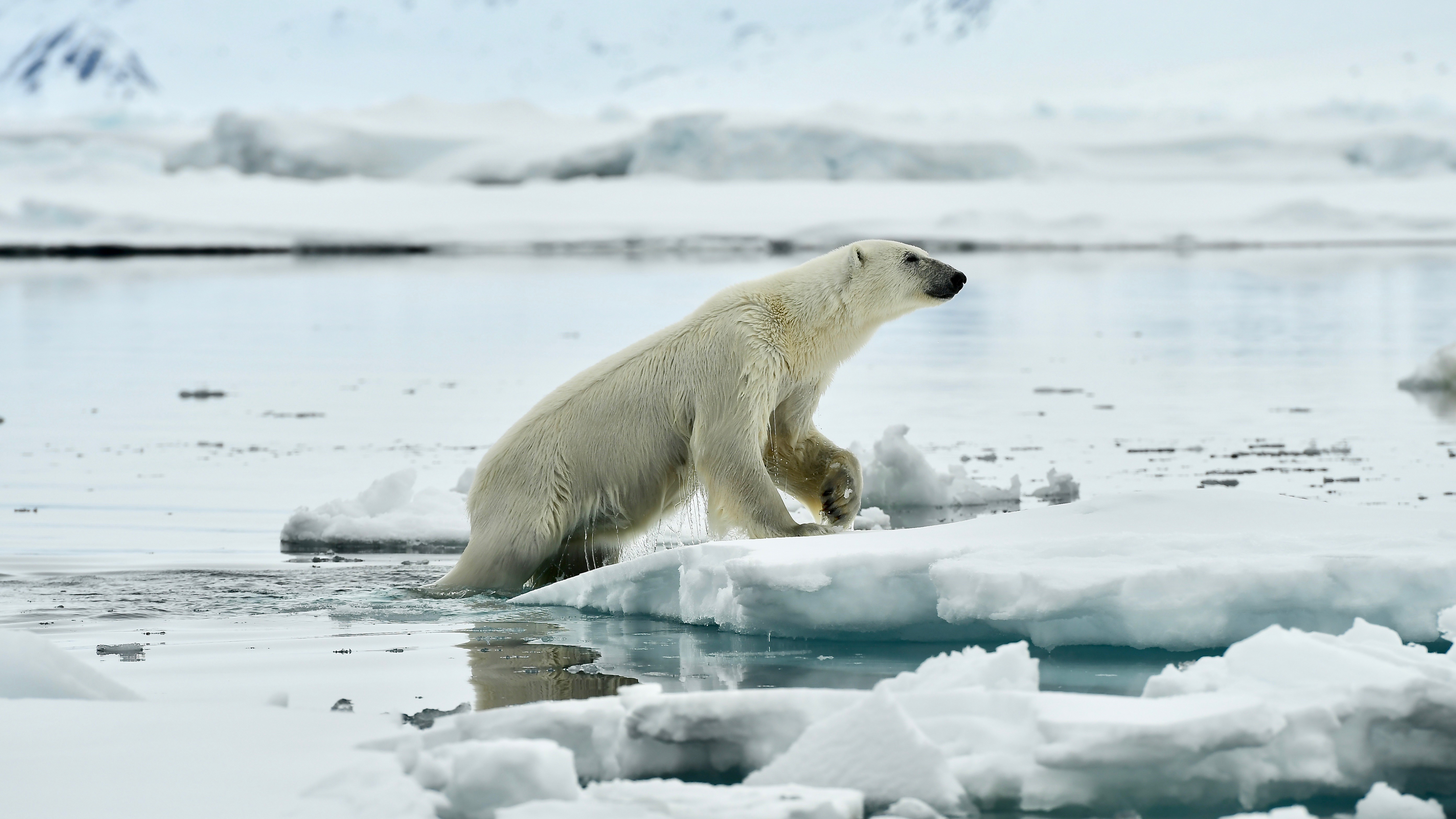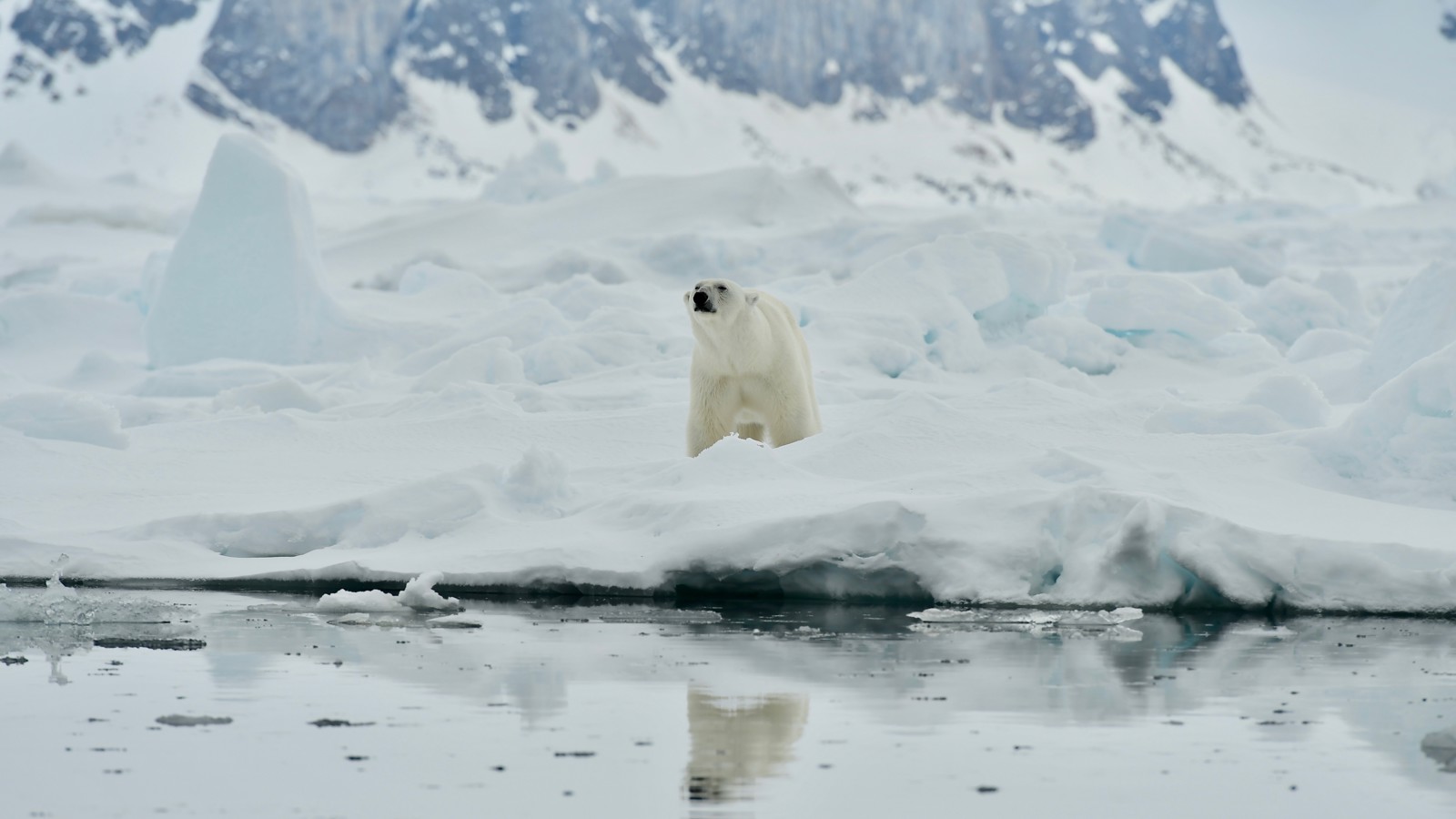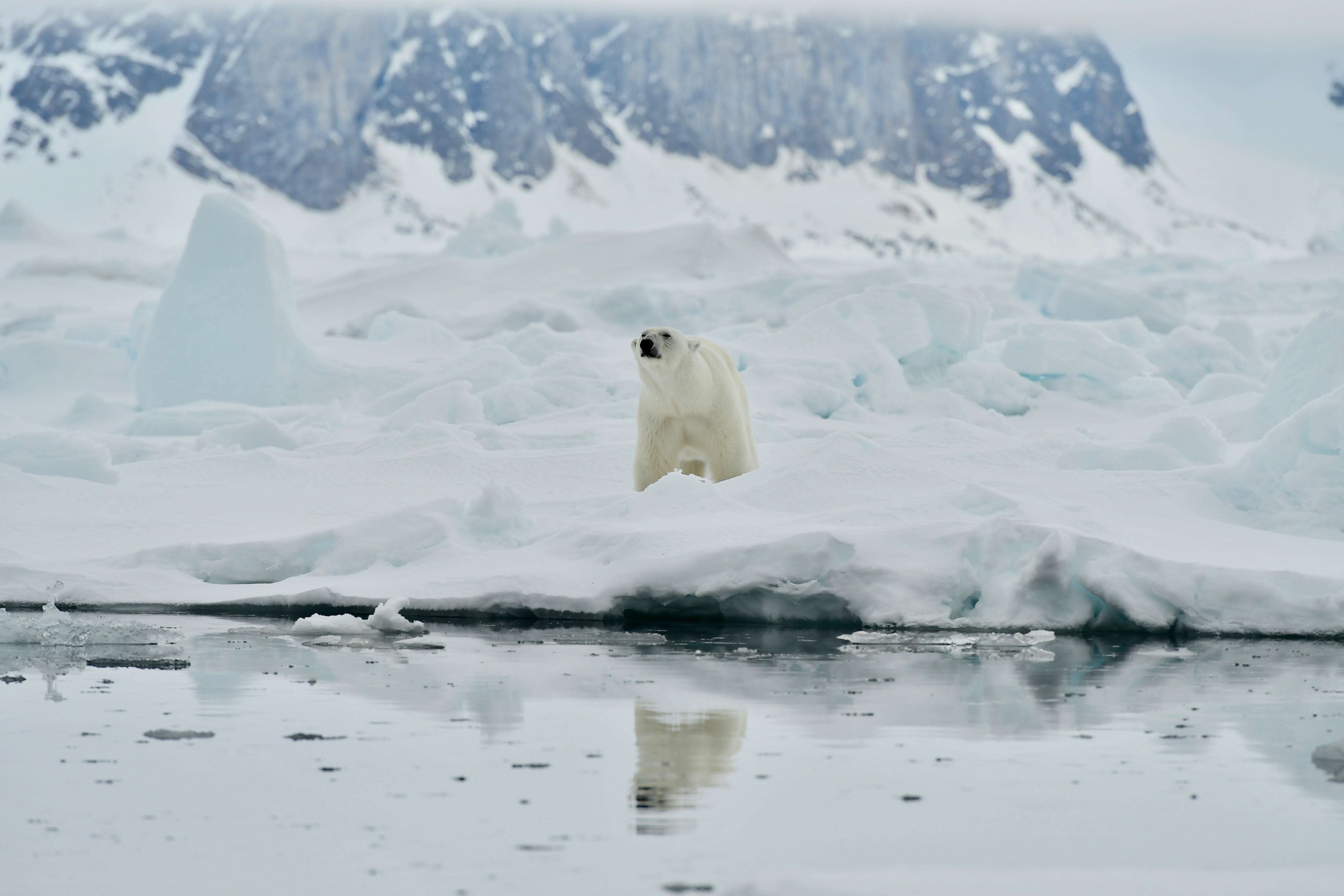 Plötsligt får vi ett meddelande från fartyget över radion. Isbjörn på isen! Vi skyndar oss tillbaka till M/S Quest och ser en gul prick röra sig på packisen – en björn! Den går mot bergen i bakgrunden och vi tar ett snabbt beslut och ger oss ut i gummibåtarna igen. Björnen har gått fram mot iskanten och vi glider parallellt med den. Den vädrar i luften och verkar ha fått syn på M/S Quest då den går i rask takt mot fartyget. Björnen går fram till fartyget, tar en tur runt om och simmar ut till ett isflak bakom fartyget. Vi får verkligen en fantastisk uppvisning. Den hoppar ner och upp ur vattnet, rullar sig i snön och stannar upp då och då. Efter att björnen har rört sig i cirklar runt fartyget simmar den in till packisen igen och vandrar iväg längs samma kurs som innan, mot bergen i bakgrunden. Vilken fantastisk upplevelse!