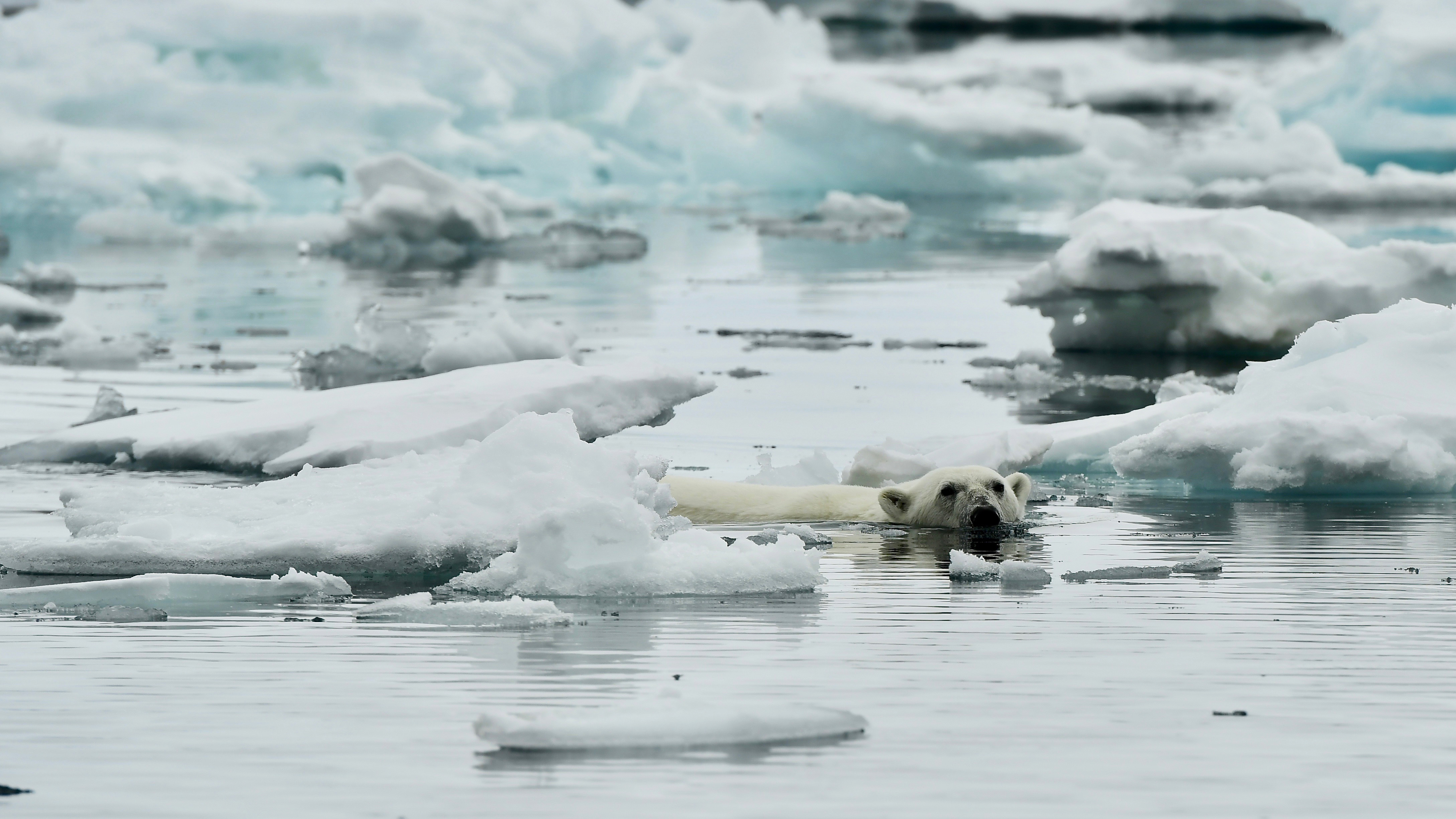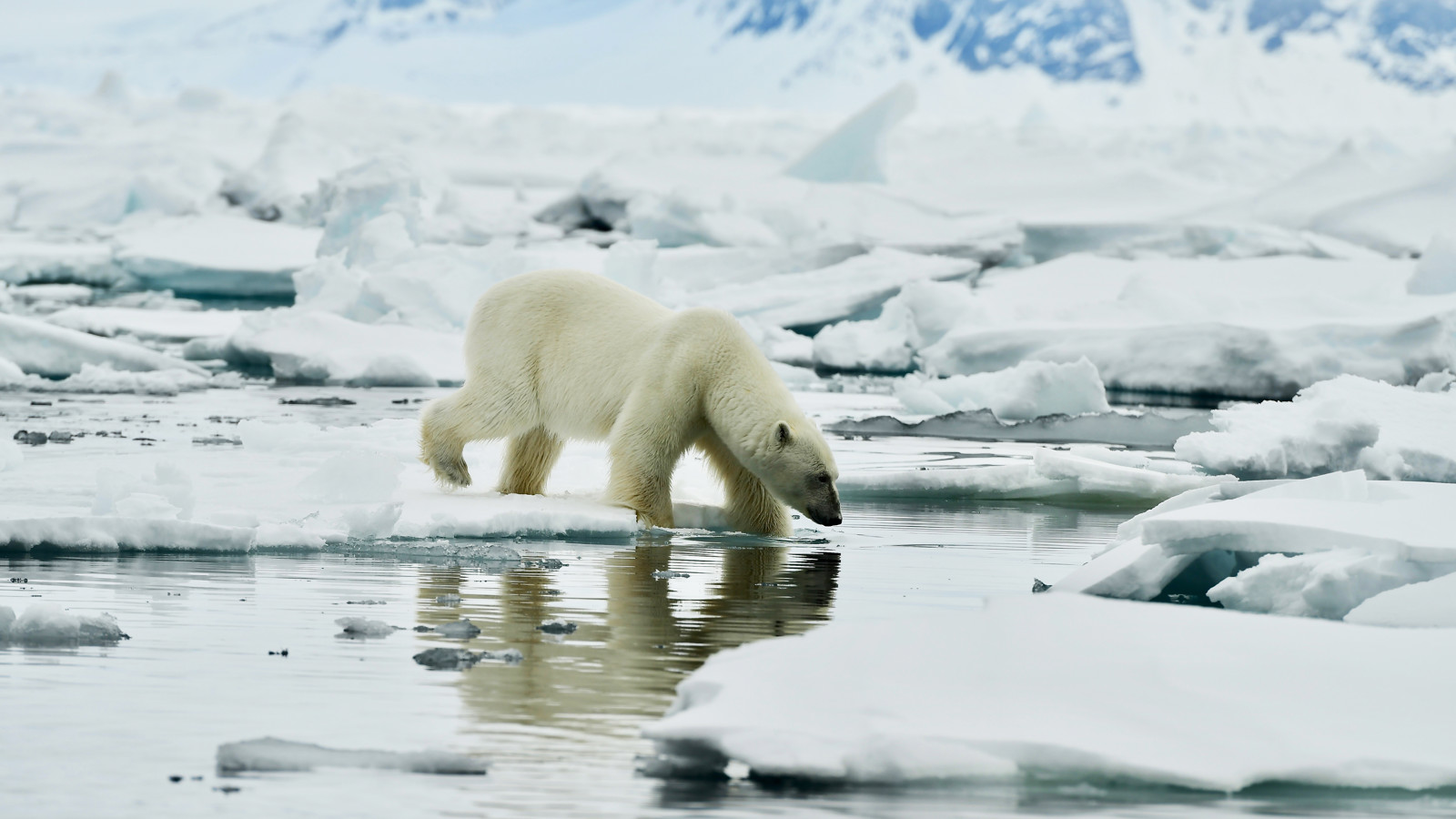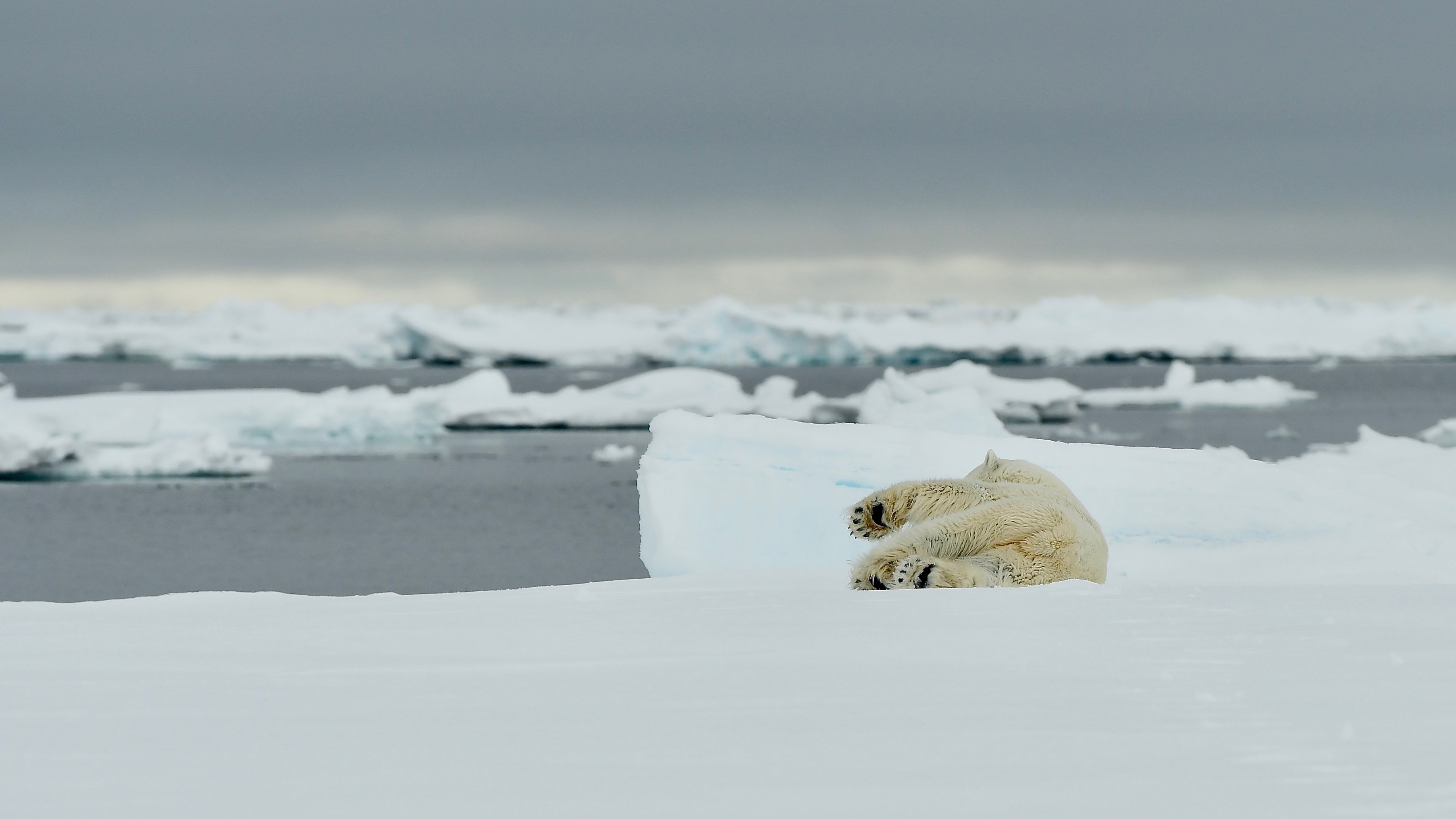 Plötsligt får vi ett meddelande från fartyget över radion. Isbjörn på isen! Vi skyndar oss tillbaka till M/S Quest och ser en gul prick röra sig på packisen – en björn! Den går mot bergen i bakgrunden och vi tar ett snabbt beslut och ger oss ut i gummibåtarna igen. Björnen har gått fram mot iskanten och vi glider parallellt med den. Den vädrar i luften och verkar ha fått syn på M/S Quest då den går i rask takt mot fartyget. Björnen går fram till fartyget, tar en tur runt om och simmar ut till ett isflak bakom fartyget. Vi får verkligen en fantastisk uppvisning. Den hoppar ner och upp ur vattnet, rullar sig i snön och stannar upp då och då. Efter att björnen har rört sig i cirklar runt fartyget simmar den in till packisen igen och vandrar iväg längs samma kurs som innan, mot bergen i bakgrunden. Vilken fantastisk upplevelse!