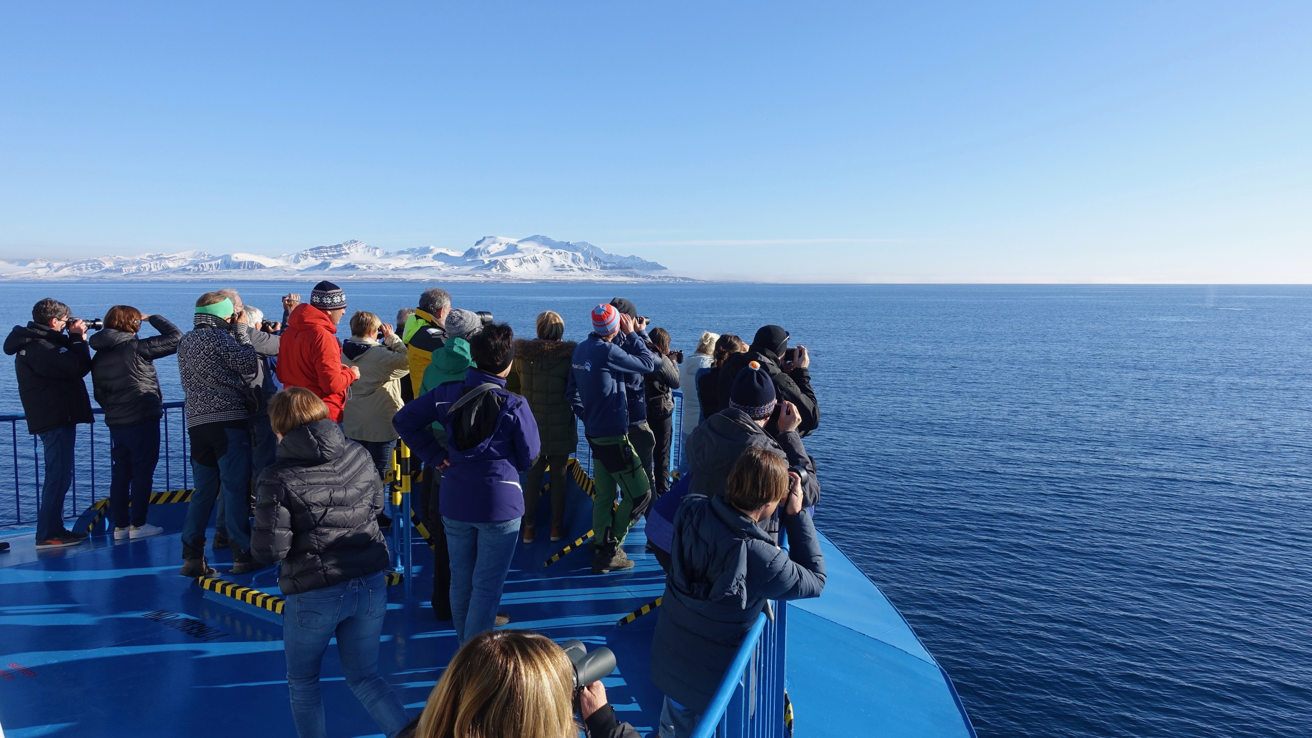 Vädret kunde inte ha varit bättre, och just innan vi lämnade Isfjorden bakom oss fick vi se en grupp knölvalar simma runt båten. Därefter seglade vi genom det vackra Forlandssundet i härlig midnattssol. Vilken start på vårt arktiska äventyr!