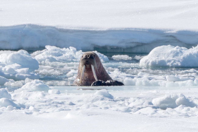 Efter en magisk morgon i drivisen fortsatte vi norrut och rörde oss in i tjockare och mer kompakt is, där isflak långsamt pressades bort. Här såg vi flera valrossar ligga på isen, några ensamma och några i grupper. Även om det var på avstånd hade vi turen att få uppleva en vacker syn av en valrossko med sin lilla kalv, som kanske bara var några dagar gammal.