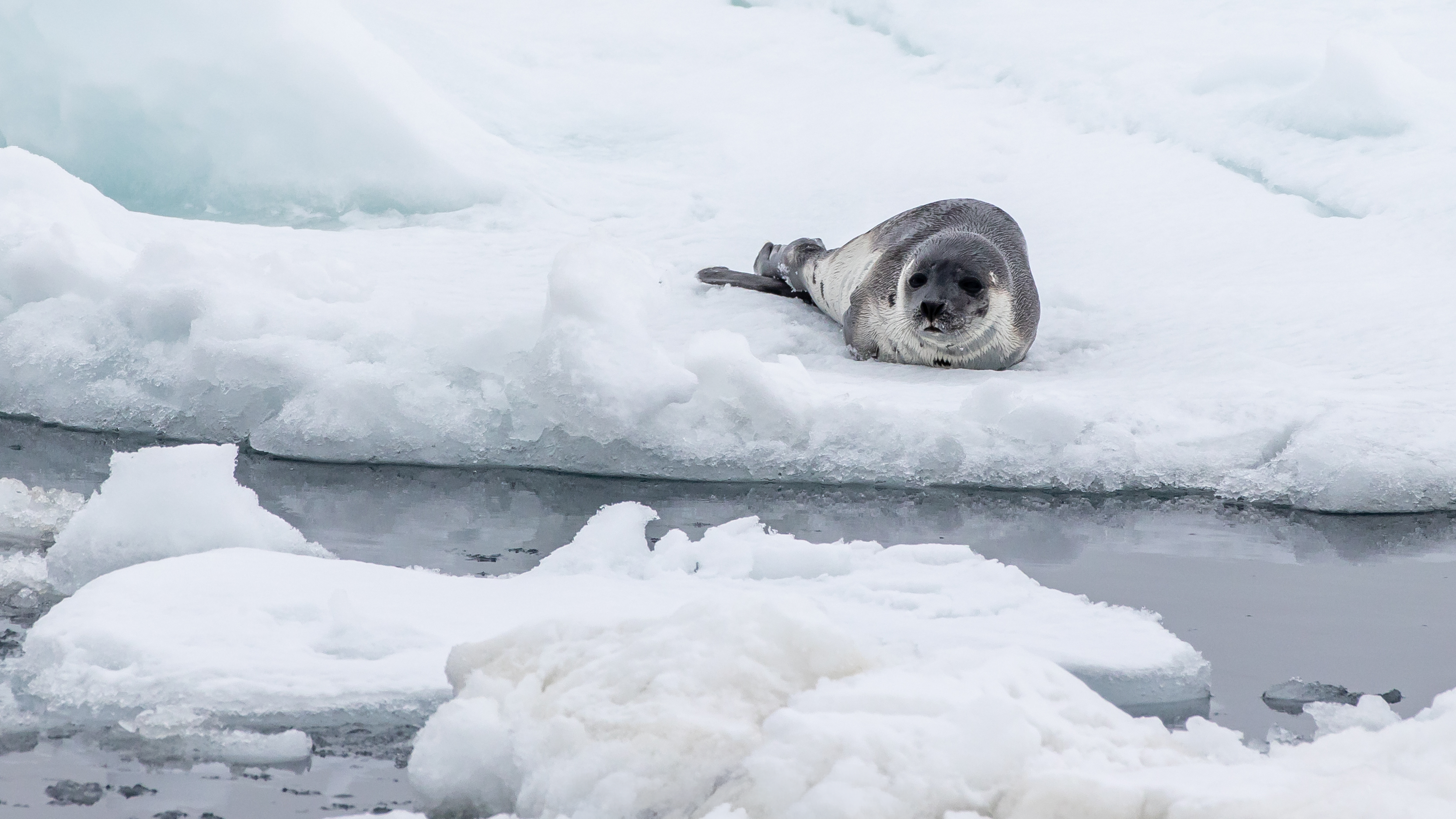 Ju närmare vi kom iskanten, desto svagare blev vinden – och som så ofta i Arktis innebar det också att dimman rullade in. Bland isflaken såg vi gott om tretåiga måsar, spetsbergsgrisslor och alkekungar som födosökte. Under lunchen lättade dimman avsevärt, vilket gjorde att vi kunde ge oss ut med Zodiacerna – och till vår stora glädje hittade vi ett stort och stabilt havsisflak där vi kunde gå i land. Därefter fortsatte vi med Zodiacerna och fick syn på skäggsäl som vilade på isen.