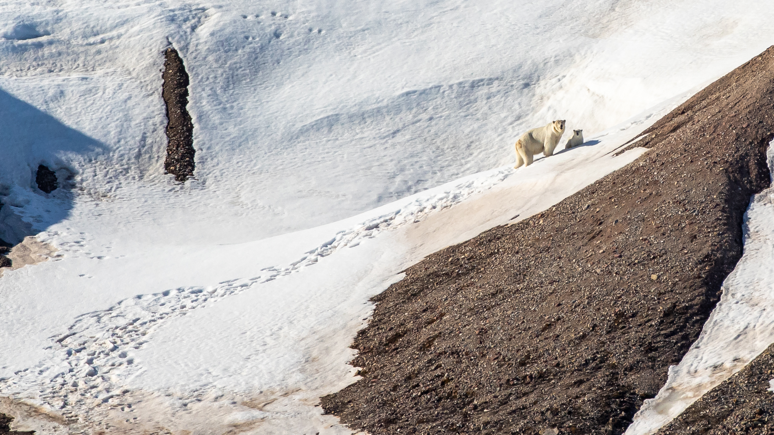 Vi iakttog de två isbjörnarna från fartyget, på ungefär 900 meters avstånd, men de syntes tydligt genom våra kikare. De åt på ett kadaver som låg på stranden, men flera gånger såg vi hur ungen blev skrämd av vitvalar som kom nära strandlinjen och björnarnas mat. Den lilla ungen försökte då springa uppför sluttningen för att komma undan de små vita valarna. Vi såg hur mamman tålmodigt gick upp för att hämta sin unge och leda tillbaka den till matplatsen.