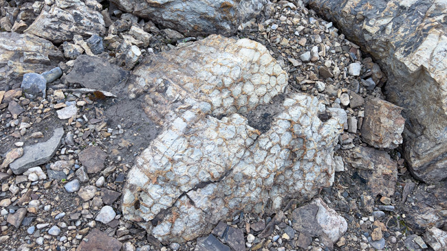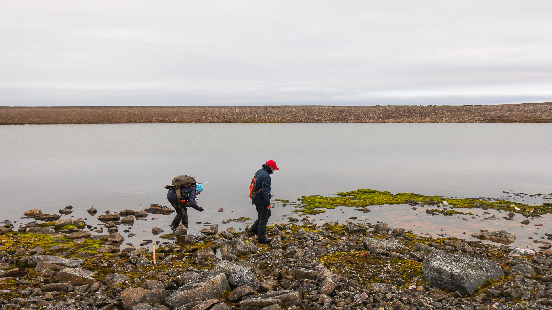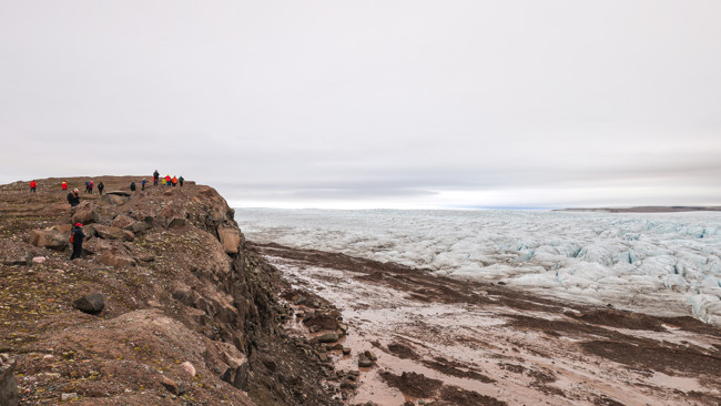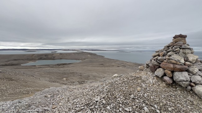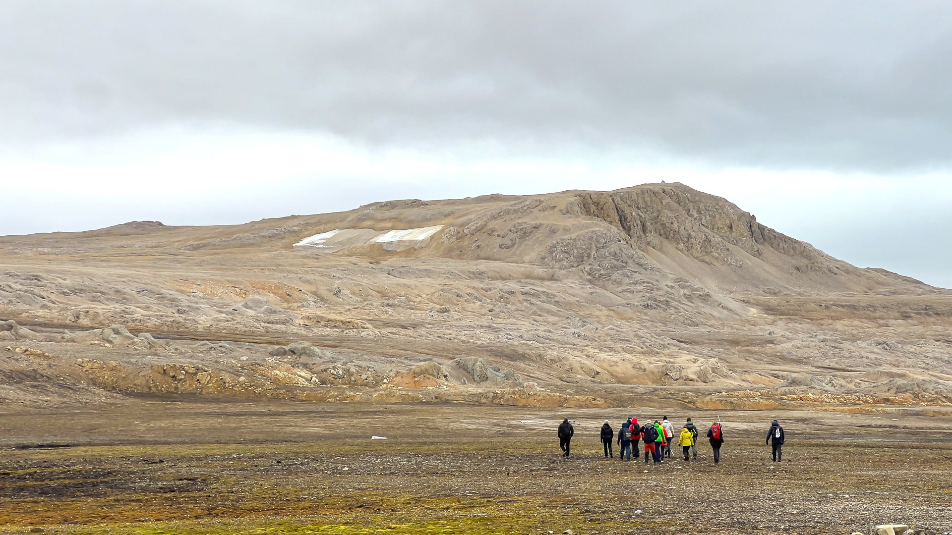 Med gruppen som valde den långa vandringen gav vi oss iväg över de upphöjda stränderna och längs åsar fyllda med Svalbards äldsta fossiler, inklusive stromatoliter. Vi fortsatte till toppen av Kinnberget, som står 128 meter högt och erbjuder en fantastisk utsikt över Murchinsonfjorden och Oddneset. Här tog vi oss tid att vila och njuta av det vackra landskapet.