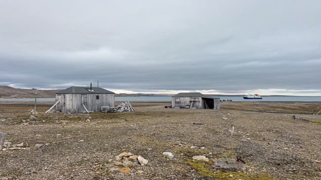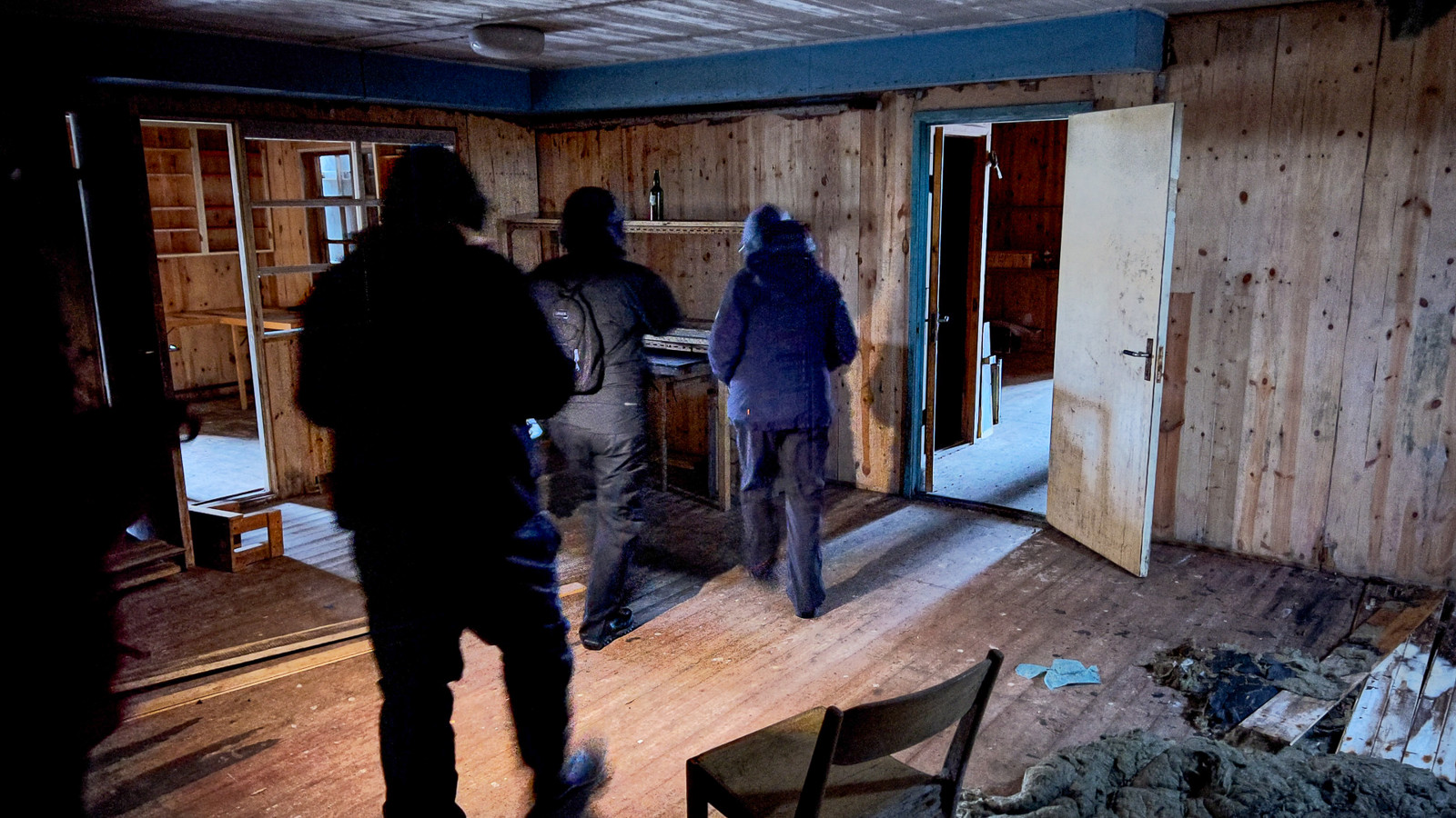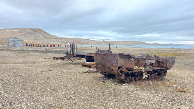 På vägen tillbaka gjorde vi en liten avstickare och tog oss tid att stanna och utforska byggnaderna i Kinnvika. Förutom stora baracker med flera sovsalar hittade vi ett observatorium för norrskensforskning och en fullständig verkstad med ett garage. Det fanns till och med en bastu (tyvärr stängd för besök) — det är ju trots allt svenskar och finnar! Vi stötte även på ett gammalt amfibiefordon, vilket väckte intresse hos flera män i gruppen.