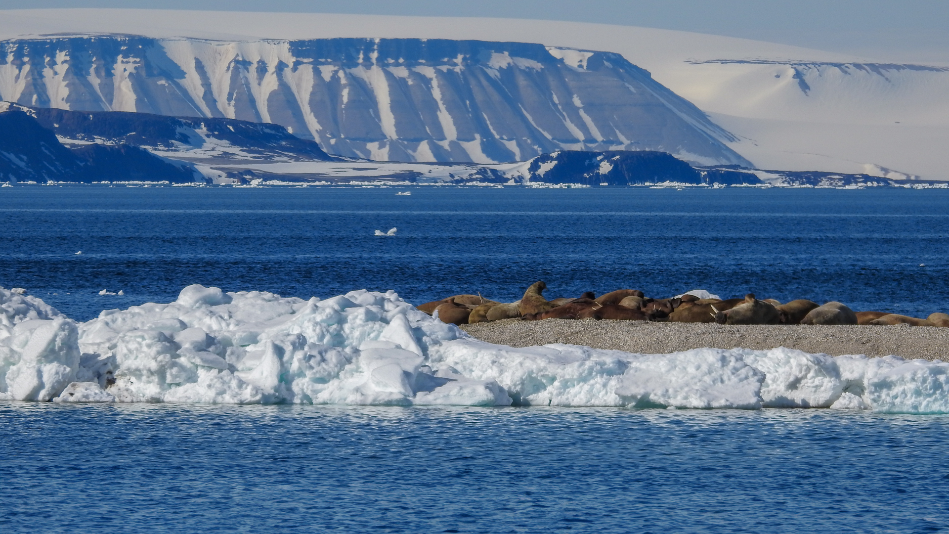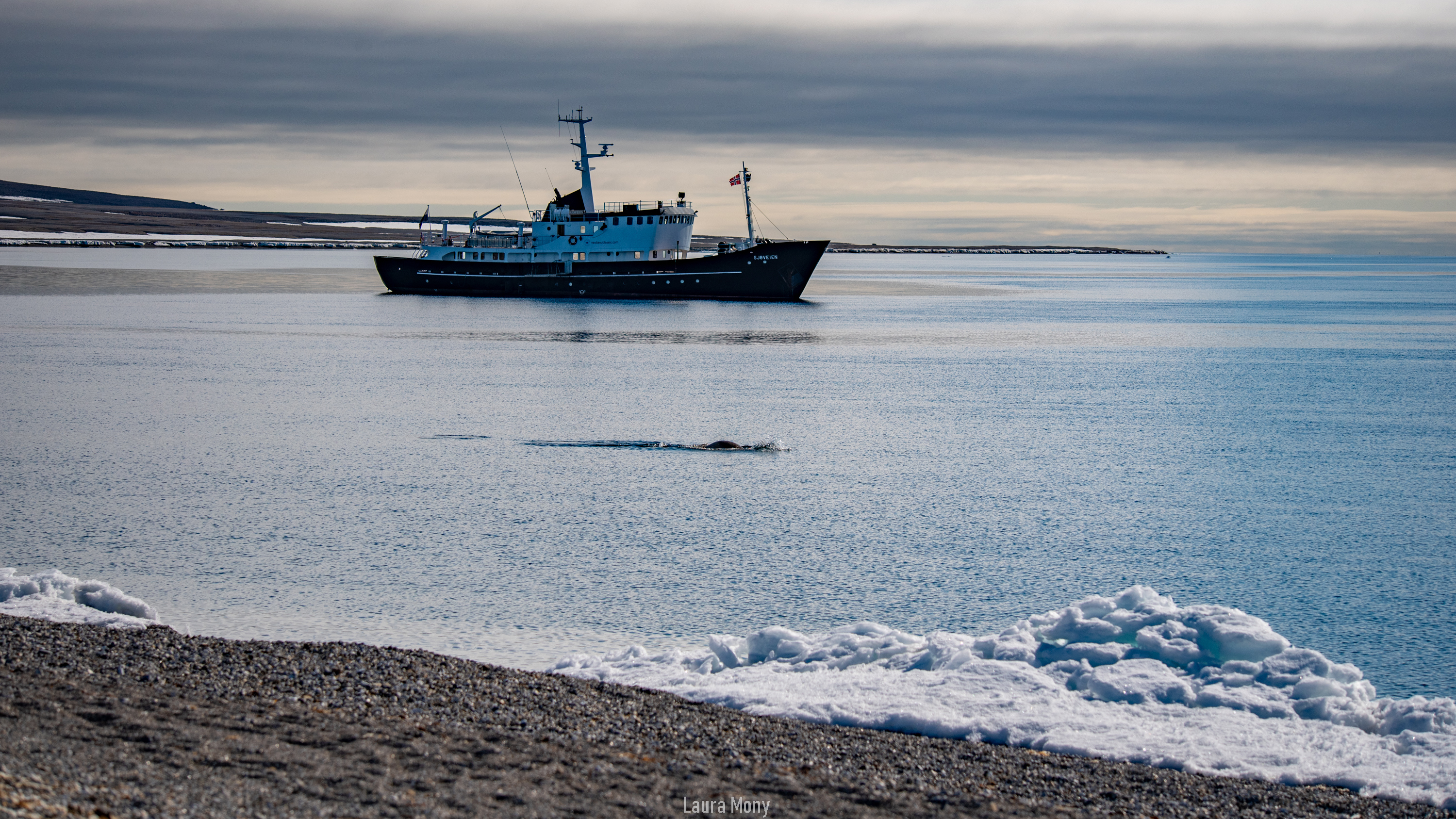 M/S Sjøveien låg för ankar framför vår landningsplats för morgonen, Torellnesset. Från fartyget kunde vi se valrossar ligga och vila på stranden. Vi sjösatte Zodiacerna och tog oss sakta mot land.