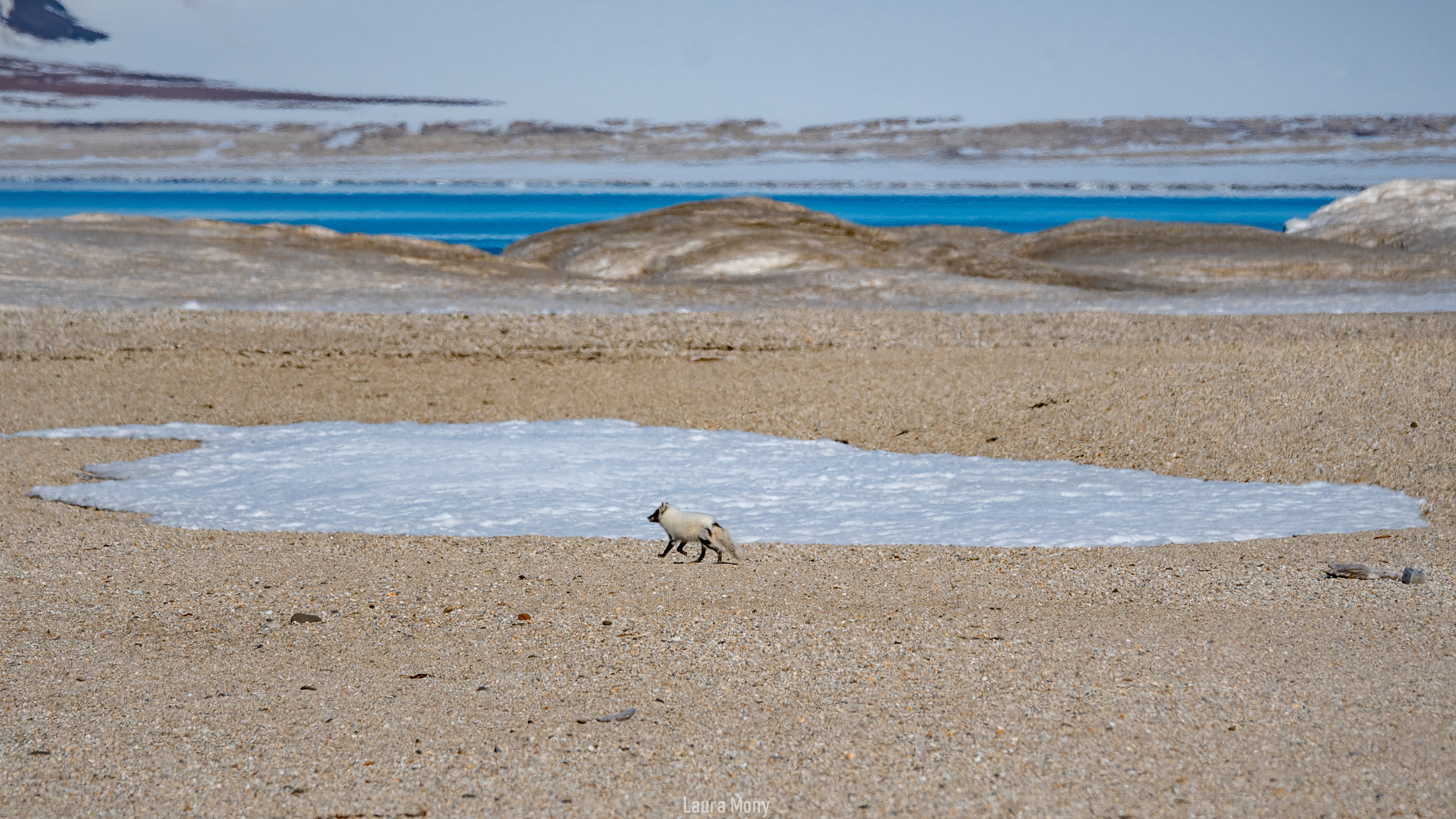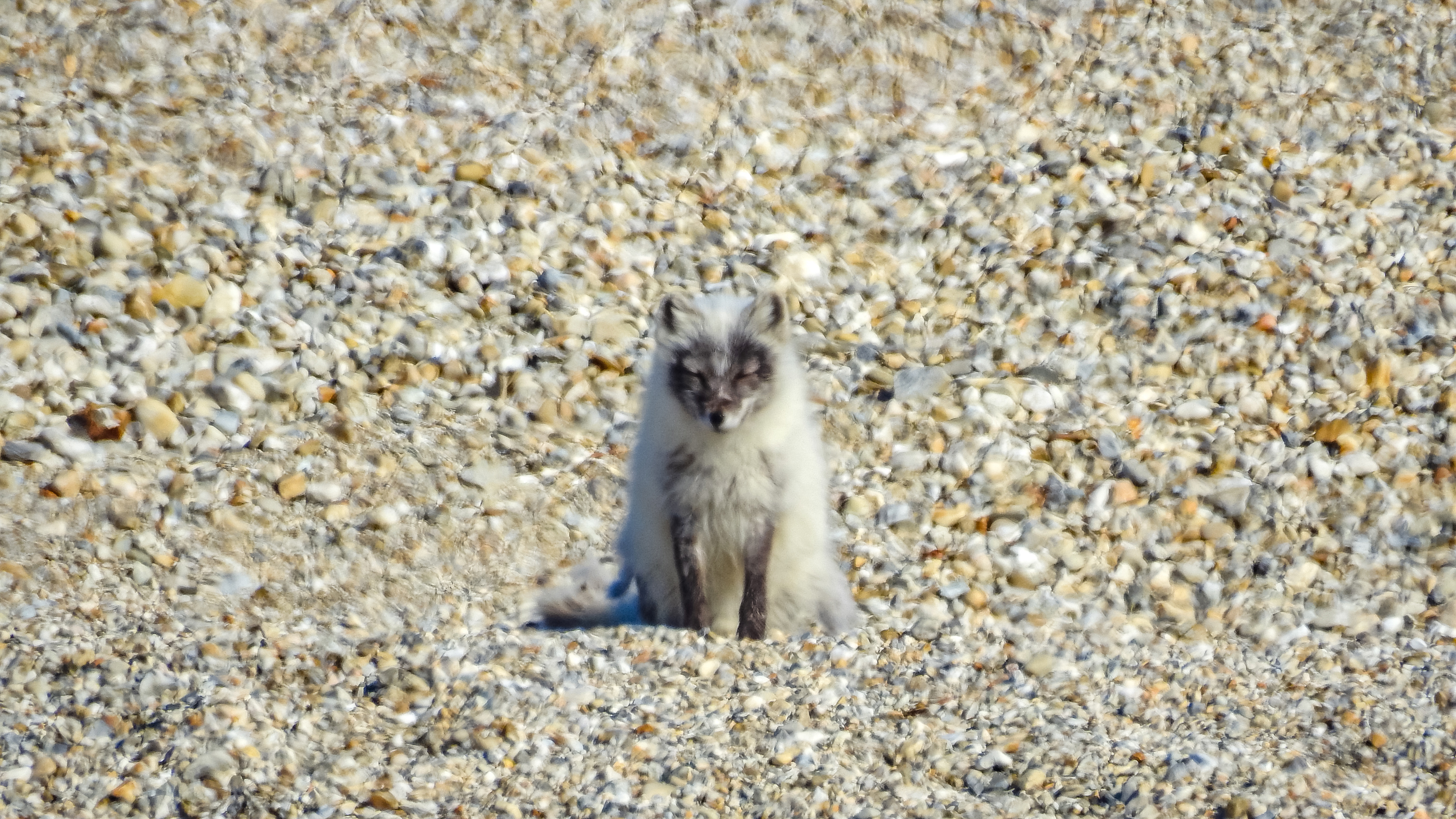 När vi tyst närmade oss dök en polarräv upp bakom kullen. Den här lilla räven höll på att tappa sin vinterpäls och var en fin blandning av vitt och brunt. Han närmade sig nyfiket innan han sprang åt ett annat håll. Vilken syn, och våra guider förklarade för oss att det är ännu ovanligare att se rävar än isbjörnar.