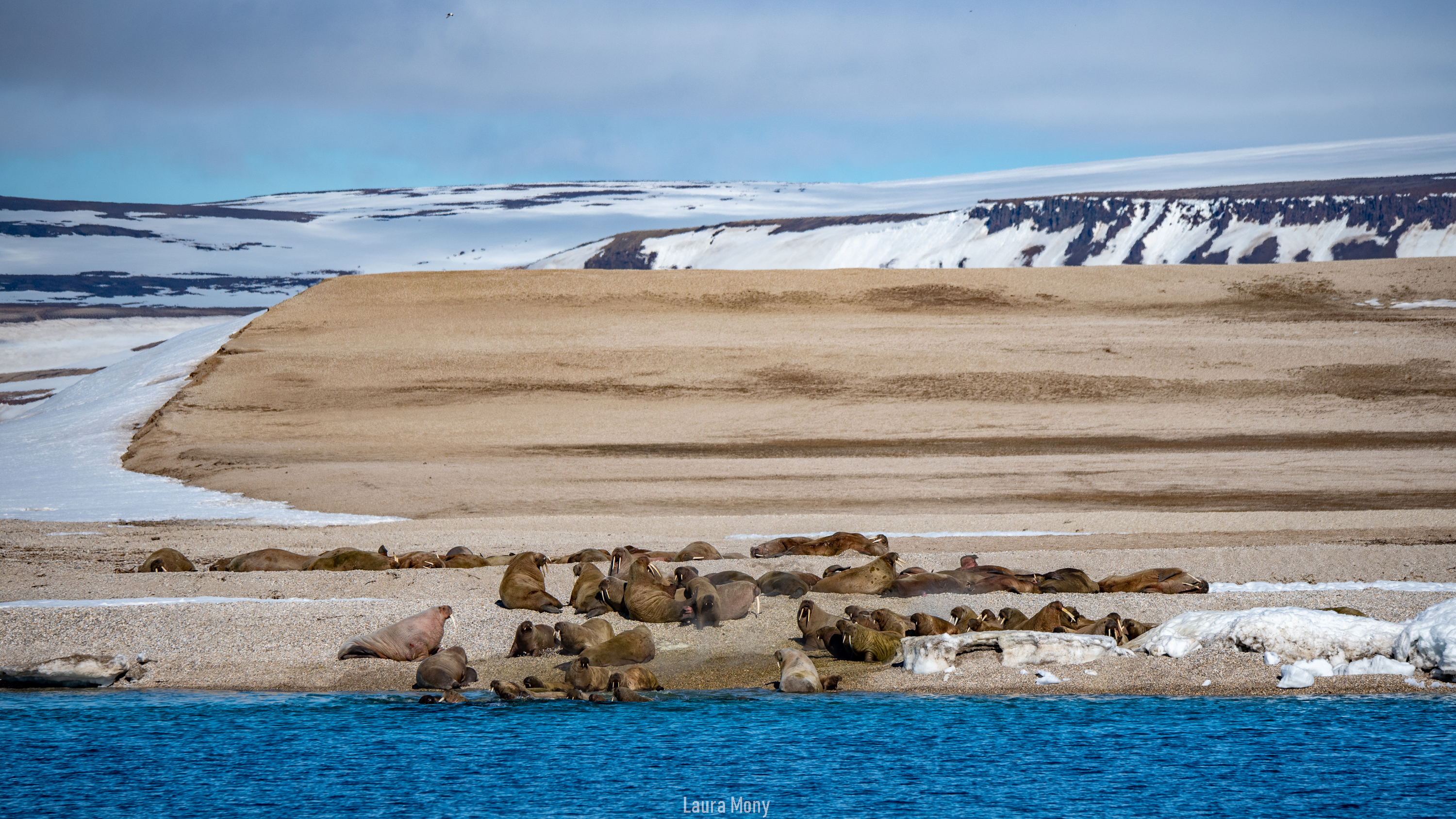Efter denna uppvisning begav vi oss mot valrossarna, som sannolikt var fler än fyrtio stycken och låg på den sandiga stranden. Det är deras favoritmiljö eftersom deras föda, musslor, finns i sanden under vattnet. De kan äta upp till 70 kg skaldjur om dagen, och lukten är en påminnelse om det.