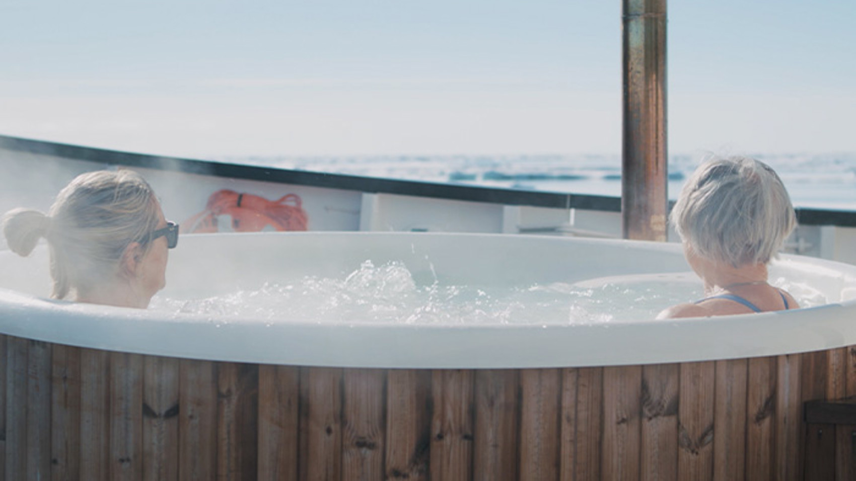 Vad kan kännas bättre än att få glida ner i ett varmt bad efter en dag i vildmarken? Ute på däck finns en vedeldad badtunna där du kan koppla av och njuta av stunden samtidigt som du ser det arktiska landskapet glida förbi.
