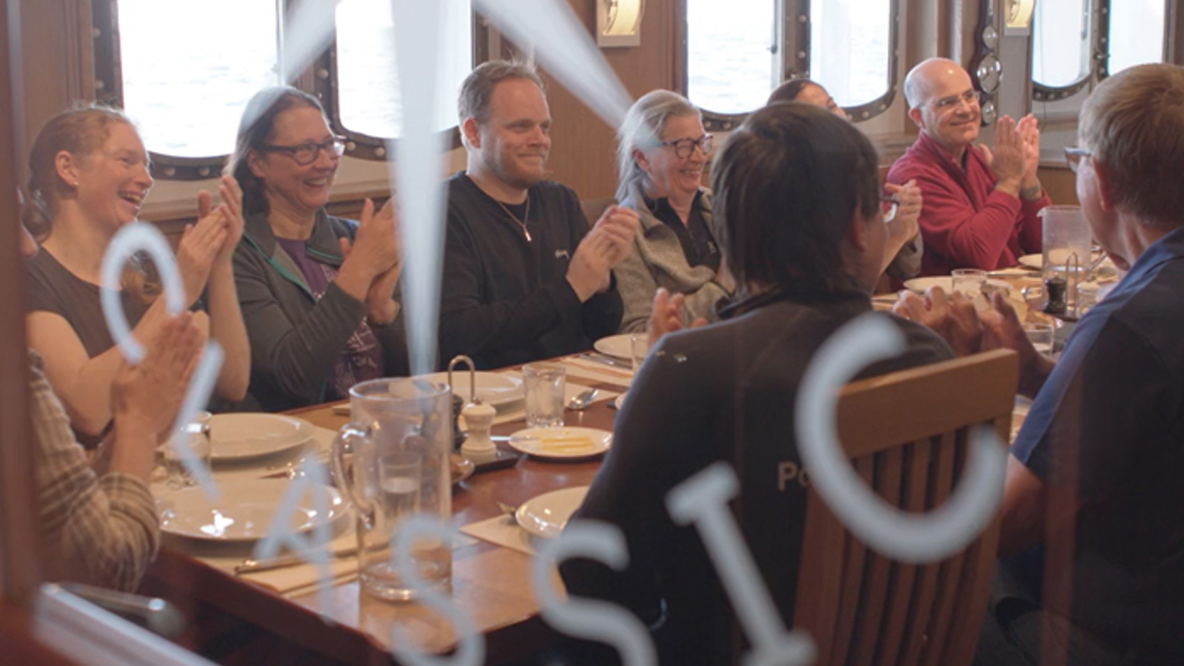 I fartygets kombinerade matsal och lounge, med plats för alla 12 passagerare vid en och samma sittning, bjuds det på tre härliga måltider per dag. Frukost och lunch är bufféer och middagen serveras vid bordet. Här kan du också höra guiderna berätta om Svalbards djurliv, natur och historia.