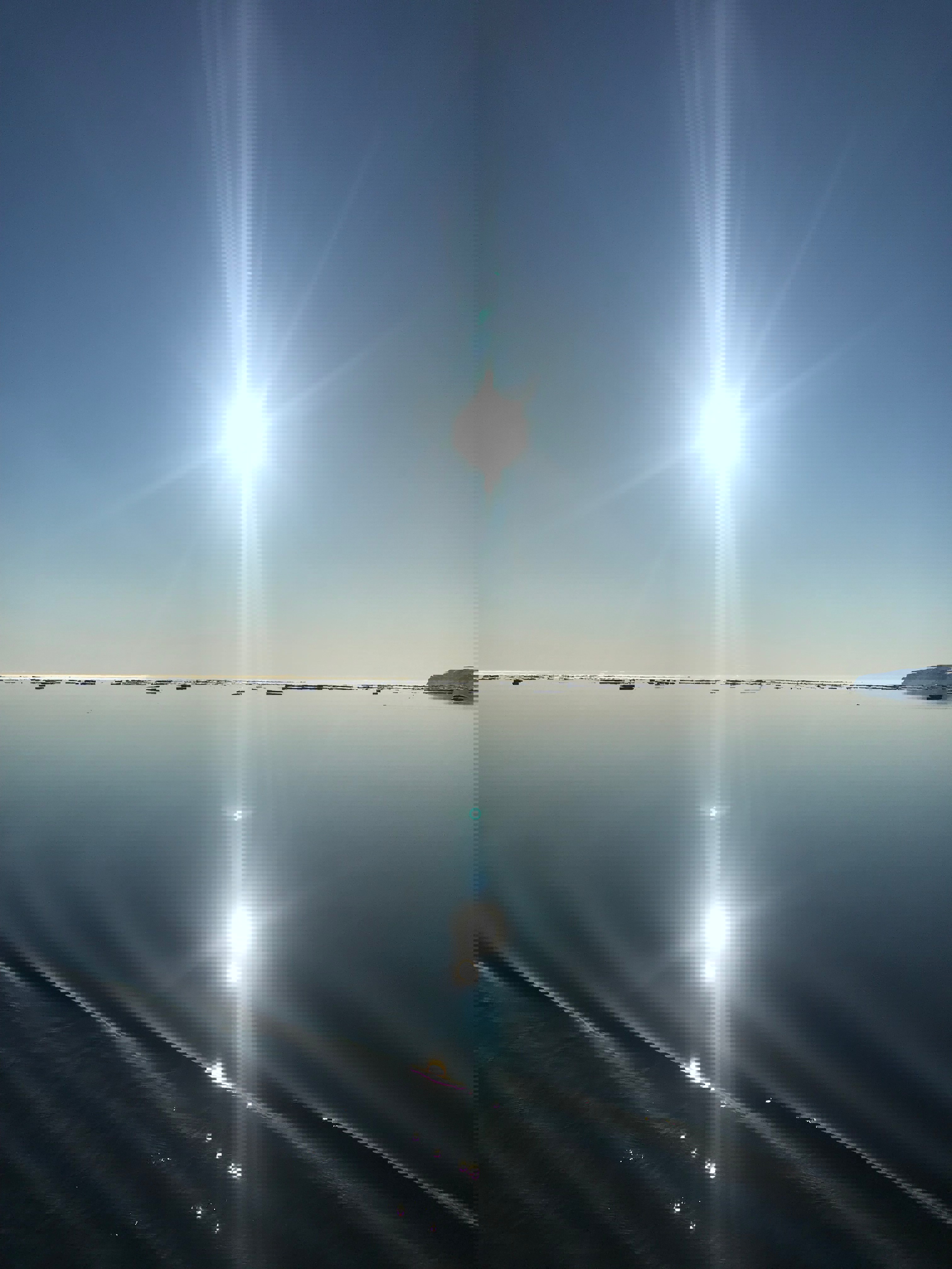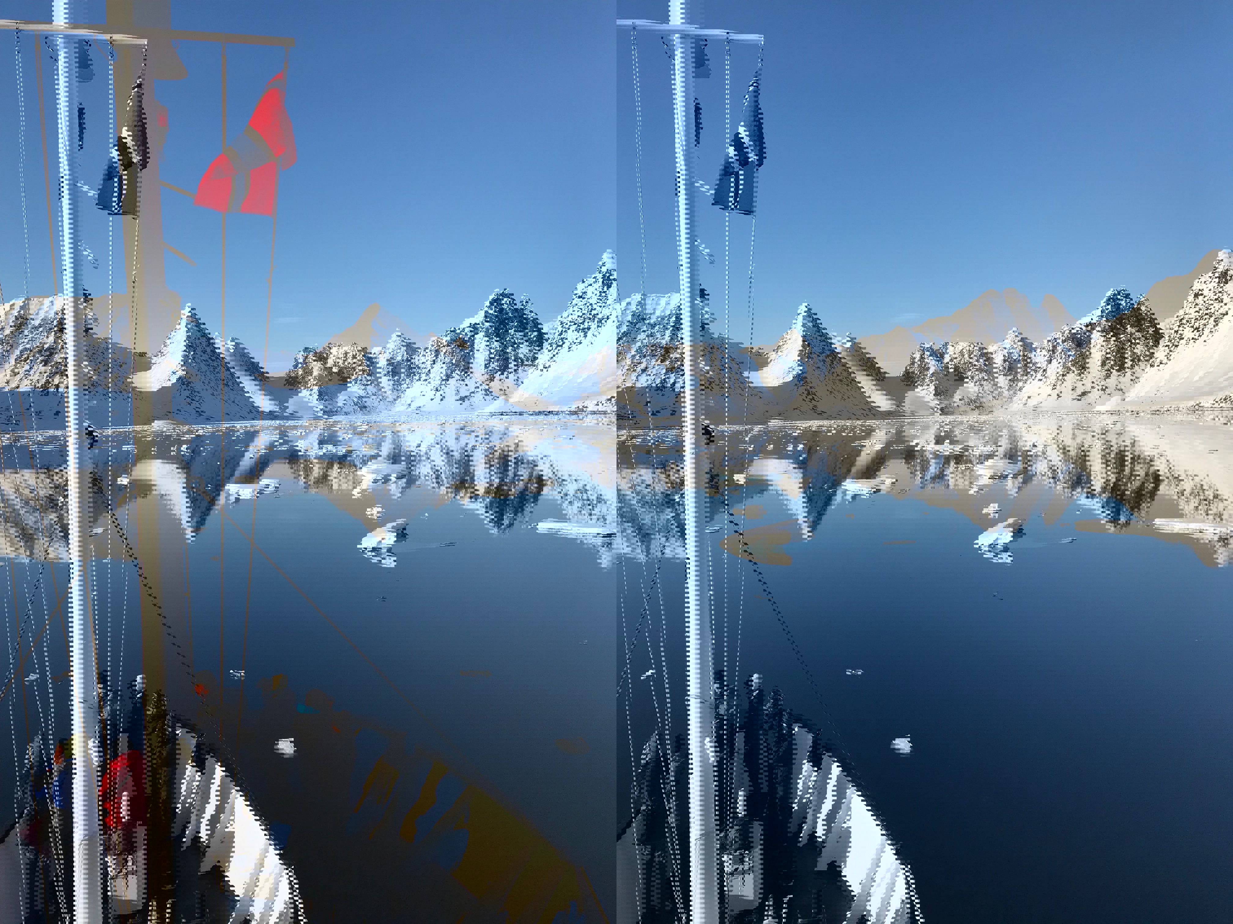 Klockan är strax före elva på kvällen när Max som reser med oss som fotograf säger att jag måste gå ut för att se hur vackert det är. Ärligt talat är det något motigt som jag reser jag mig, muttrandes något om att då måste jag ju klä mig varmare, åtminstone hämta en mössa eftersom mitt hår fortfarande är blött efter duschen jag nyligen tog. Men väl ute på däck ångrar jag inget annat än att jag inte har gått ut tidigare - havet ligger så spegelblankt omkring oss att det för ett par ögonblick är svårt att avgöra vad som verkligen är upp och ner. Horisonten är i stort sett osynlig då himmel och hav sömlöst vävs samman, och bergstopparna återspeglas nästan helt perfekt mot vattenytan.