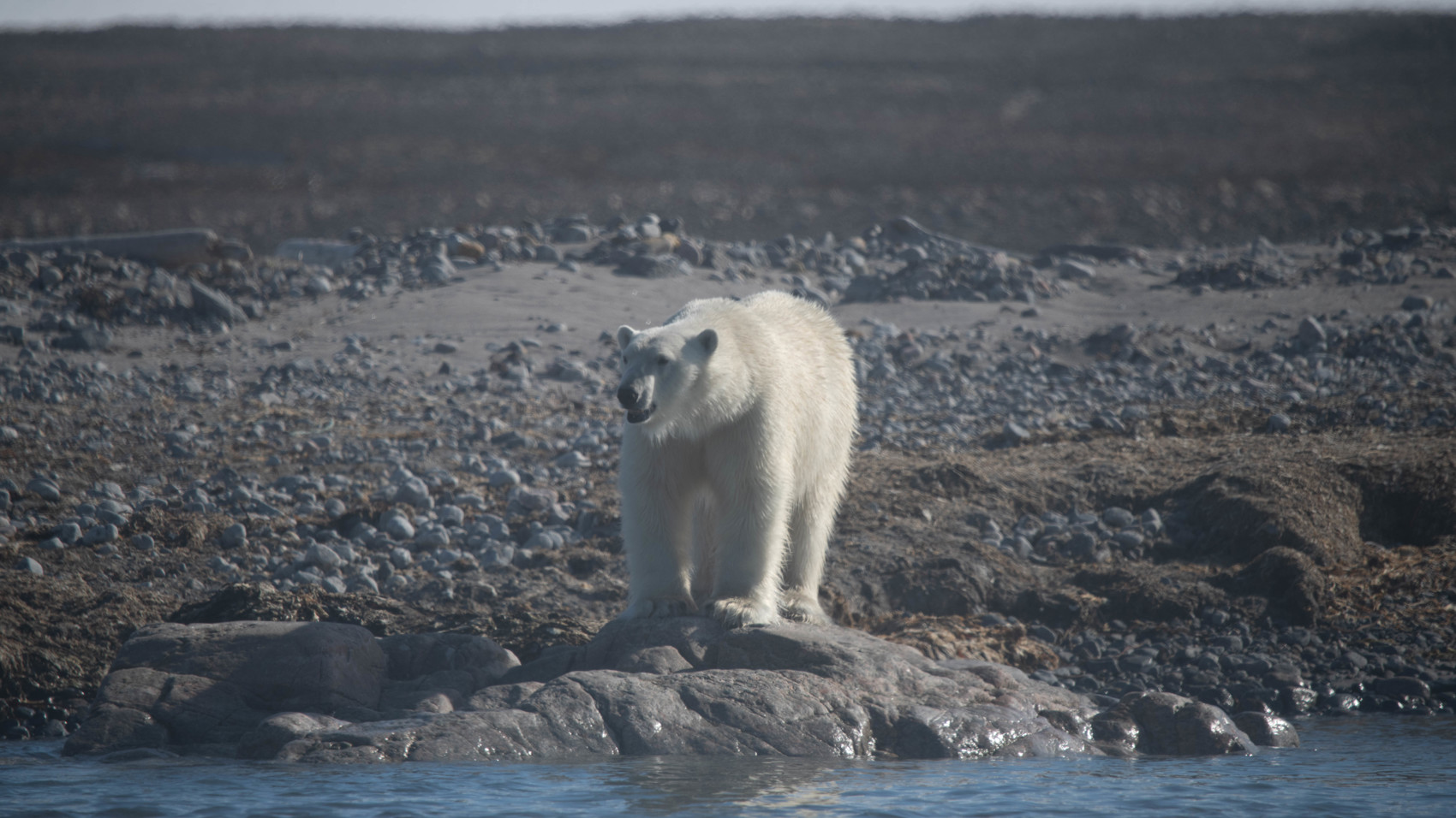 Isberg från iskappan glittrar i vattnet runt om oss när vi lämnar M/S Sjøveien i våra två Zodiacer och åker mot den svartbruna landstrippen. Vi har spanat av stranden noggrant och upptäckte en gul fläck på en liten snöfläck längs stranden. När vi närmar oss så ändrar fläcken form och ett huvud vänds mot oss. Vattnet runt grusstranden är grunt och små klippor och uddar sticker ut här och var så vi närmar oss mycket försiktigt. Närmare än 100 meter kommer vi inte men det räcker gott för att vi ska se att det är en riktigt stor isbjörns hane som ligger och vilar på snön. Den lyfter på huvudet när vi närmar oss men verkar vara fast besluten att fortsätta sin tupplur. Björnen sover obekymrat vidare och vi lyckas få några fina foton på Arktis konung innan vi far tillbaka till Sjøveien.