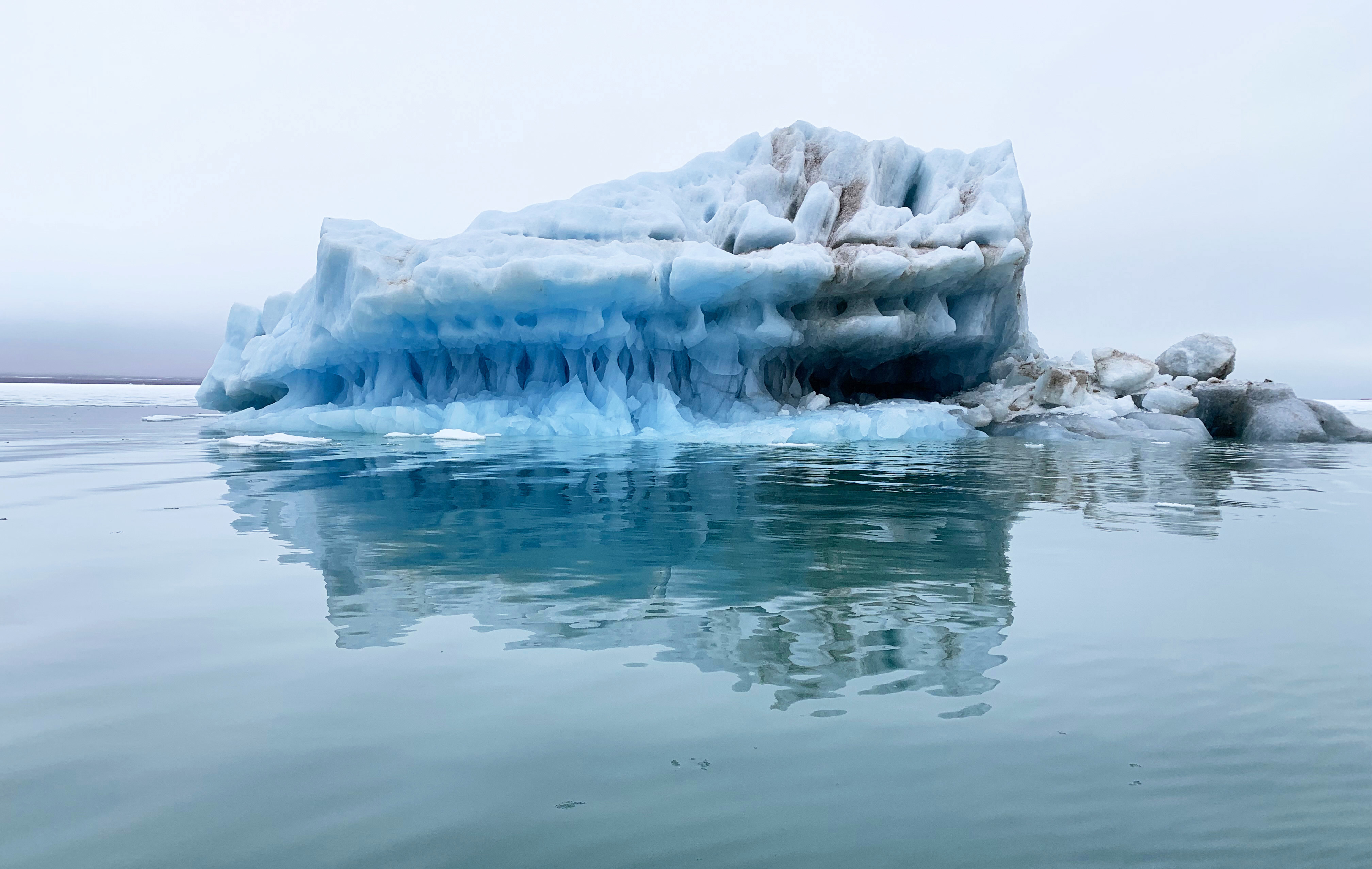 Vattnet är spegelblankt och de små isbergen som vi hittar på vägen speglar sig som målningar i vattnet. Isen är djupt blå och reflektionen i det mörka vattnet ser ut som målningar i akvarell eller olja. På islaket vilar sälar. Vi hittar både storsäl och vikare. En del ligger nära kanten på flaket men några ligger långt upp med flera kilometrar till vattnet. De måste ha grävt upp små egna andningshål i isen.