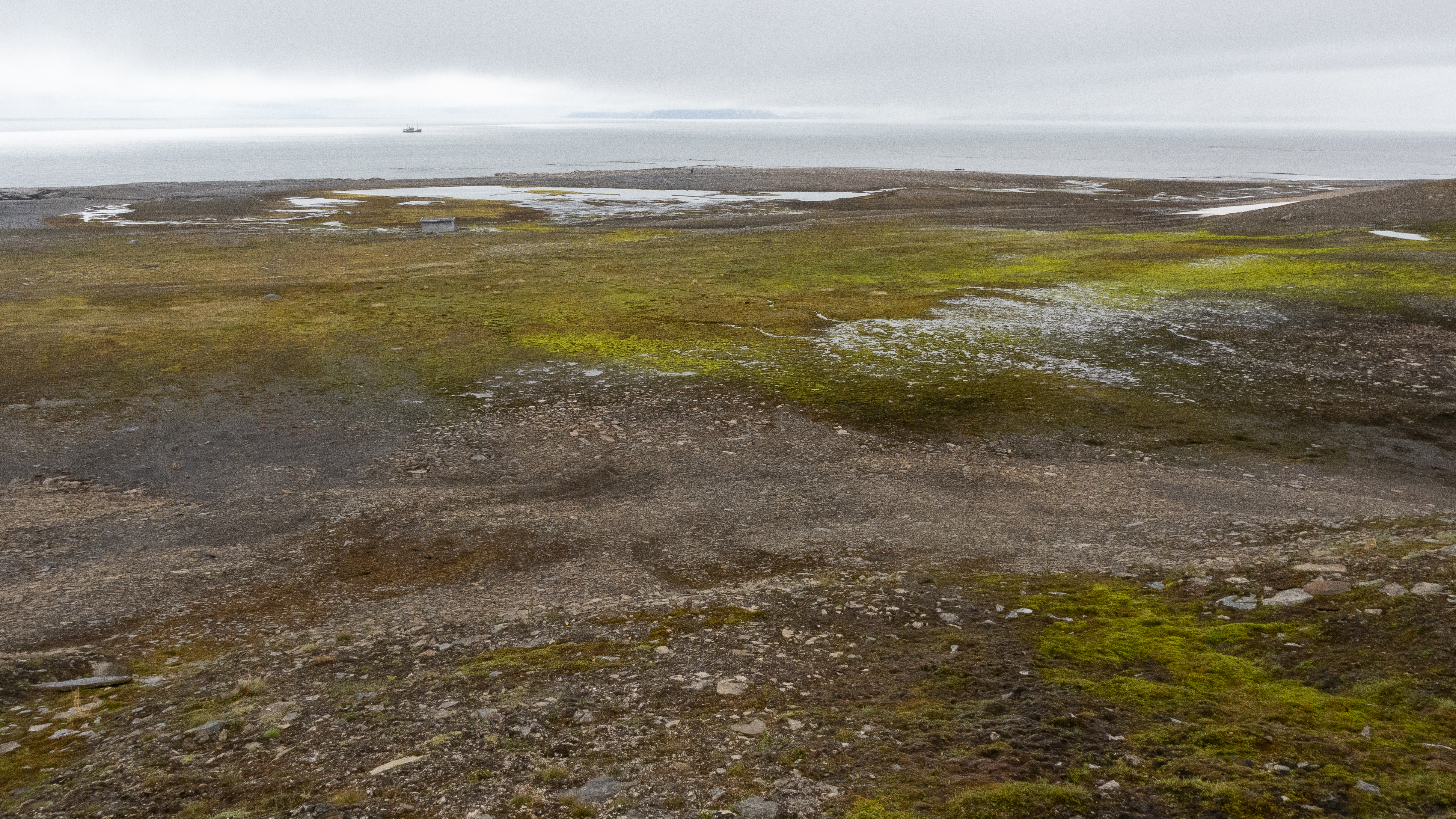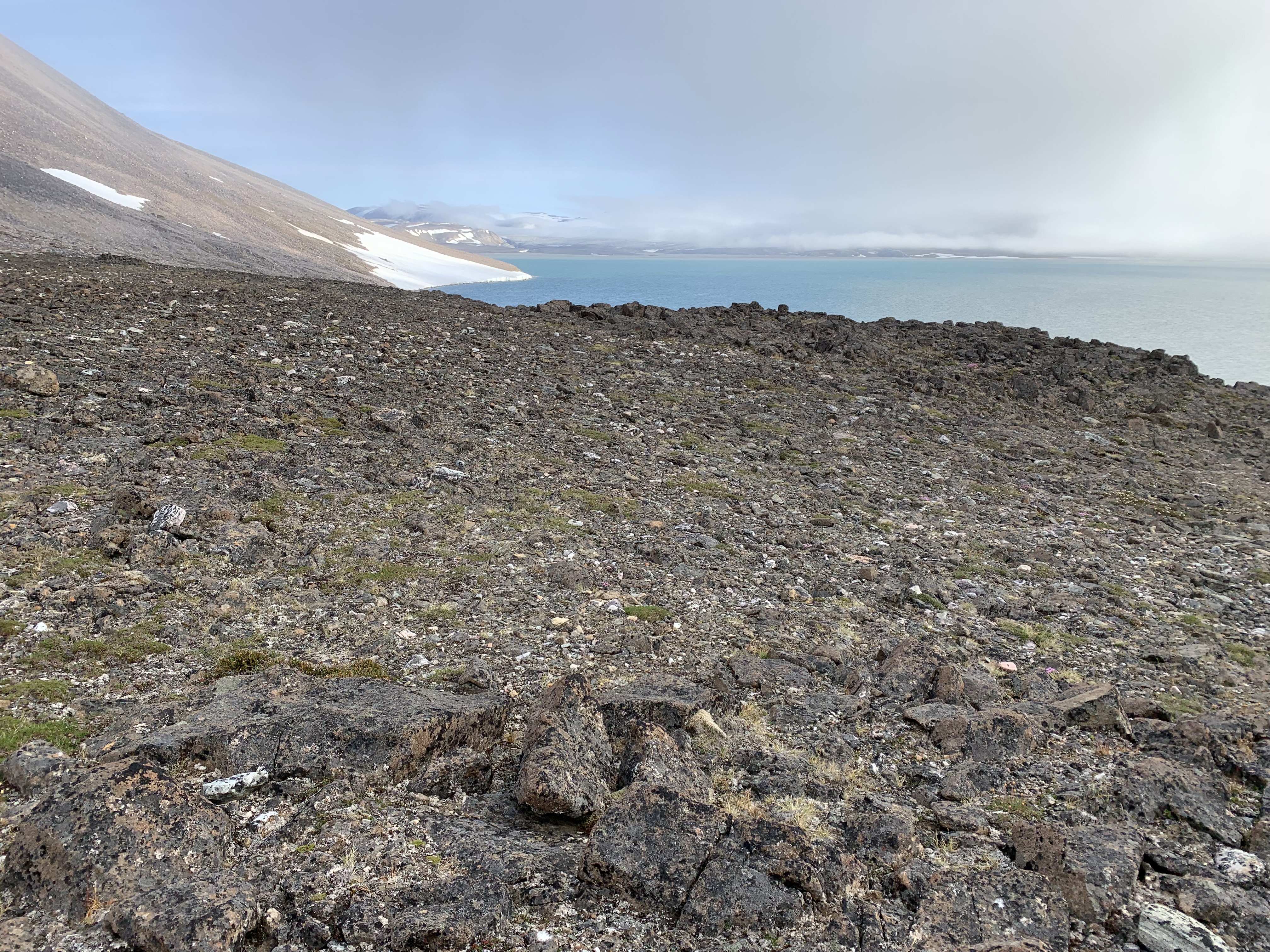 Utanför sundet är det dimmigt men när vi anländer till Boltudden på östra Spetsbergen så klarnar det och vi kan göra en landstigning. Vi vill gärna gå iland på udden därför att det har upptäckts fotavtryck från dinosaurier där. När vi landstiger så får vi leta en stund men till slut så hittar vi fotstegen. Det känns oerhört mäktigt att stå på en plats där djur från en helt annan tid rört sig och lämnat så tydliga spår.
