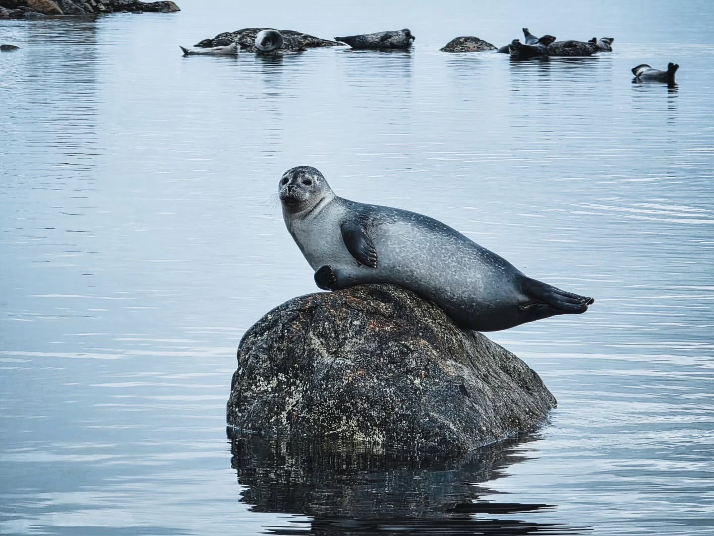 Gråsälar vilade på sina mjuka, bekväma klippor vid lågvatten och iakttog oss lugnt medan vi sakta gled förbi.