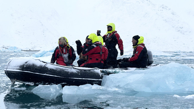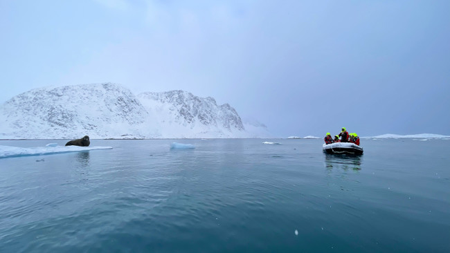 Gummibåten glider upp längs med fartyget och ett stadigt sjömansgrepp senare så är jag ombord - vattnet är stilla och det puttrande ljudet från motorn är det enda som hörs när vi fint glider fram mellan isflaken. Ganska snart är vi inte så ensamma längre utan möts av nyfikna ögon när vi närmar oss en valross som vilar på ett av isflaken. Vi har även sällskap av några sälar som dyker upp och ner i vattnet men dom är inte så intresserade av oss och stannar inte länge nog för att ställa upp på en bild. Ett gäng tretåiga måsar vilar på ett av de turkosa isbergen och ett mullrande ljud bryter tystnaden när vi på håll får se en pampig glaciärkalvning.