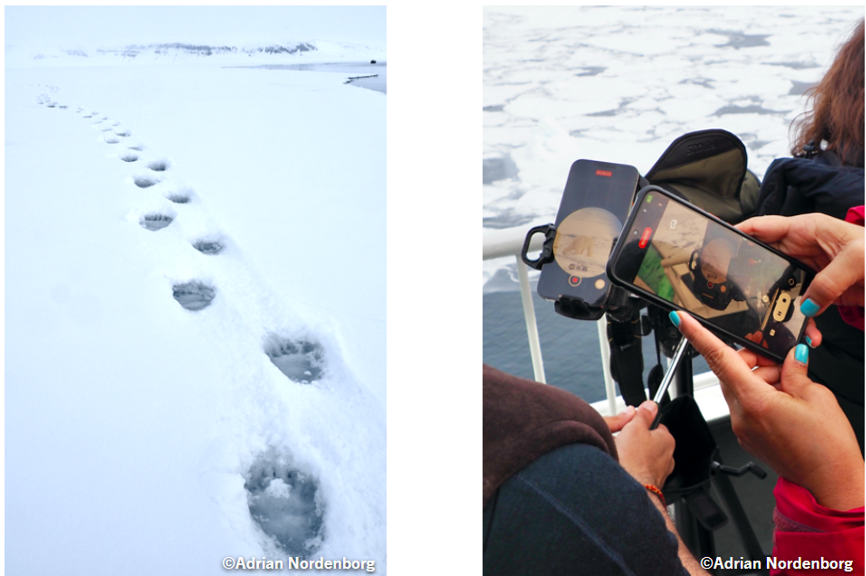 Vänligen notera! Beroende på vilket objektiv som används för fotografering eller videoupptagning kan ett djur uppfattas närmare än vad det är. Vi följer alltid rådande riktlinjer i Arktis för att försäkra oss om att vi inte stör djurlivet.