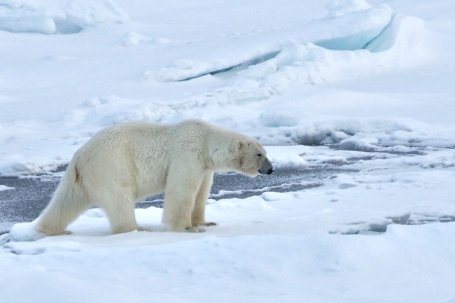Men det var inte bara olika sälar som förgyllde vår resa. Guidernas outtröttliga spanande gav resultat och vi fick möjlighet att studera ”Kungen av Arktis” i dess rätta miljö. Första isbjörnen vandrade nyfiket längs iskanten och reste sig upp på bakbenen och blickade ut över havet. Var det möjligen den simmade ringsälen som björnen fått vittring på? I våra ögon såg det dock ut som att isbjörnen stod och vinkade till oss. Den andra björnen upptäcktes i fjärran då den lufsade med bestämda steg vidare bort över ett bergskrön. Tredje björnen som vi träffade på var en ung hona som bjöd på en makalös uppvisning. Vi betraktade henne när hon hoppade från isen ut i vattnet, därefter dök hon in under isen och körde upp huvudet genom olika hål som en säl och upprepade sin ”lek” ett flertal gånger. Vi hade förmånen att njuta av björnens sällskap en god stund innan vi fortsatte vår färd längre in i fjorden.