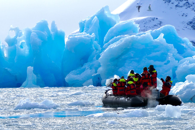Vi utforskade fler fjordar och det var som att glida runt i ett konstgalleri då vi beundrade de vackra blå glaciärerna och dess tillhörande isberg.