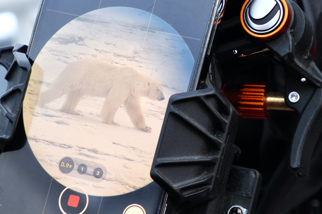 Ombord på M/S Quest hade vi en tubkikare som användes flitigt hela resan. Till kikaren fanns ett fäste för s.k. "digiscoping", vilket uppskattades av alla ombord. Vi fäste en mobil så att vi kunde filma genom tubkikaren och resultatet blev förvånansvärt bra.