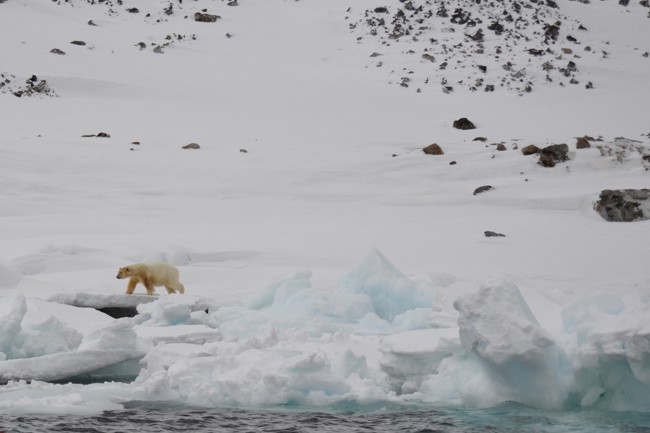 På eftermiddagen skulle vi tuffa vidare mot packisen i norr. M/S Quest snurrade runt och pekade fören rakt mot Nordpolen men kaptenen hann knappt få upp någon fart innan en av hans besättning ropade stopp. Han stod med kikaren och stirrade stint in i det vita landskapet. "Polar bear", sa han sedan och pekade på en vit liten hög en dryg kilometer bort. Isbjörn, var det verkligen sant? Det fanns mängder av vita små högar därute så det var svårt att urskilja. Vi tuffade närmre o närmre. När vi var 600 meter bort såg vi allihop att han hade haft rätt. Björnen hade rest sig och gått rakt mot oss och nu grävde den i marken efter något. Vi beslöt oss för att lägga oss stilla och se vad den tänkte hitta på. Nu fick vi lära oss att om man ska se isbjörn får man ha tålamod, björnen grävde o grävde samt vilade och efter kanske fyra timmar beslöt vi oss att röra oss norrut igen.