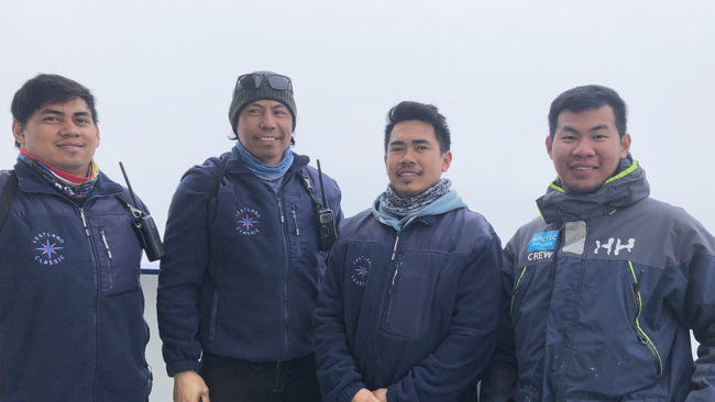 När vi ger oss ut med Zodiacerna, de uppblåsbara gummibåtarna vi använder, är det däckbesättningen under ledning av bosun Anthony som ser till att Zodiacerna är pumpade, tankade och sjösätts med kran från aktern. Till sin hjälp har han Ralph, Gerick och Chester. De hjälper också gästerna att på ett säkert sätt komma ombord på Zodiacerna, trots vågor och vind.