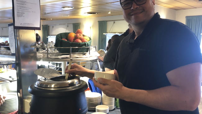 För att vi ska trivas ombord krävs en välfungerande hotellavdelning, det vill säga hytter och restaurang. Ansvarig för detta är Noe. Han är från Honduras och otroligt erfaren. Han började arbeta ombord på fartyg för 39 år sedan och har under årens lopp arbetat på de flesta stora kryssningsfartyg, tills han 2009 började på M/S Quest. Normalt byter besättningen fartyg ganska ofta, men när Noe kom till M/S Quest insåg han att han hade hittat hem.