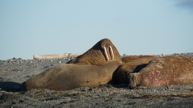 Färden fortsatte vidare och plötsligt uppenbarar sig Storøya i horisonten, med sin enorma kappa av is. Havet låg stilla som olja när vi gick ut med gummibåtarna igen den kvällen för att utforska vår mest östra destination. Längs med kusten guppade ejdrar och stormfåglar. En grupp lata valrossar lyfte undrande på sina huvud för att sedan återgå till sömnen. Ett par av dem simmande förbi oss på avstånd och vi kunde höra dem andas ut luft när de kom upp till ytan i tystnaden. När vi stängde av vår motor var det en bedövande vacker tystnad. En lyckad dag i norr och en förväntan när vi fortsatte vår resa in i Polarnatten med den eviga solen framför oss.
