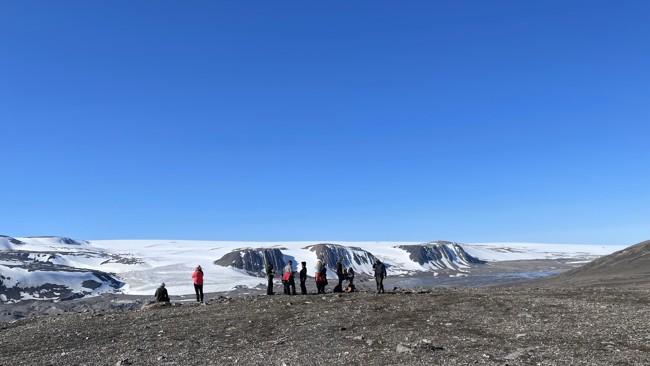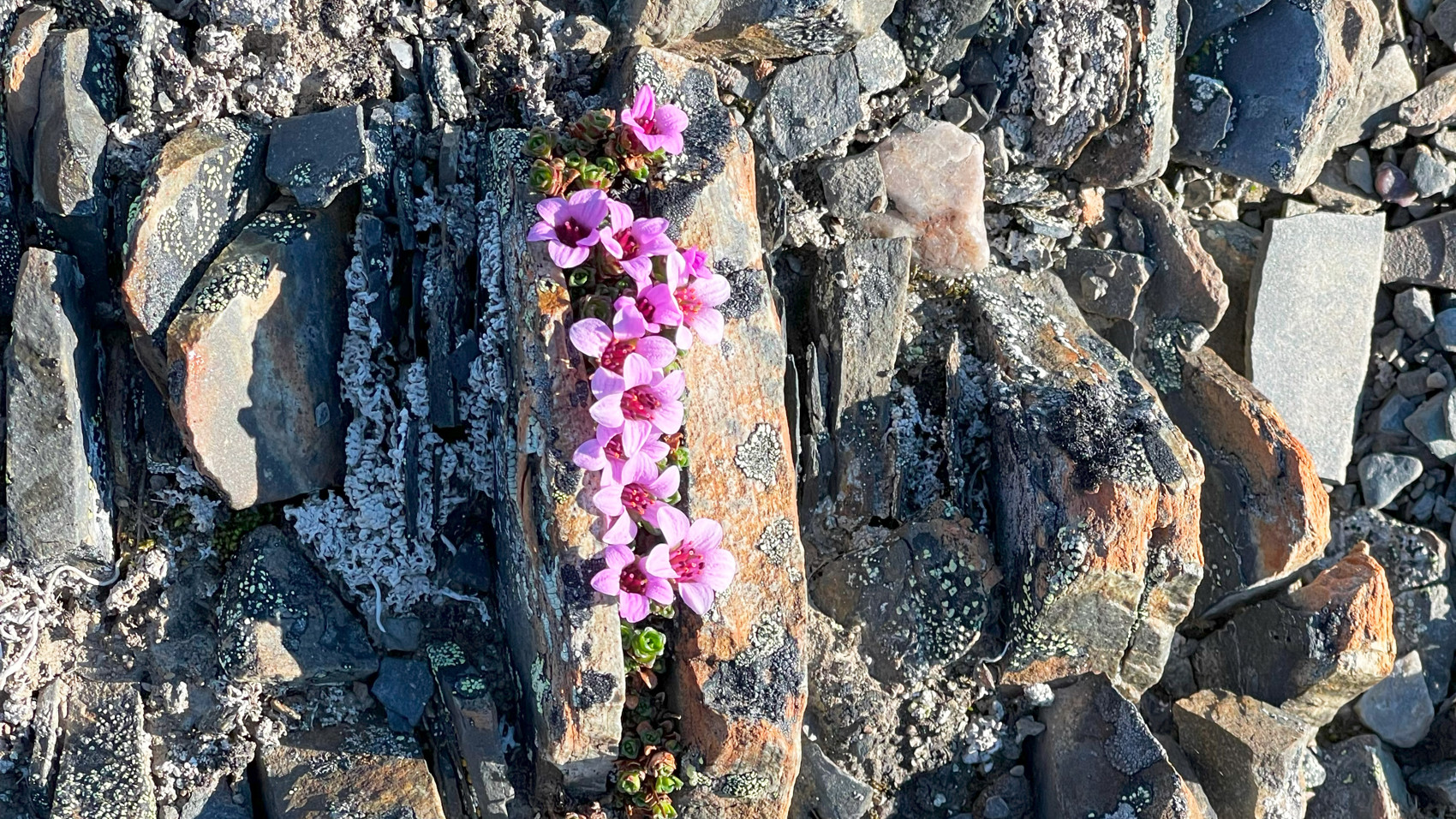 Vid Faksevågen började vandringen med en relativt brant ås men redan efter några steg stannade vi för att titta på växtlivet. Vegetation gömde sig i varje liten spricka, där kan den hitta tillräckligt med skydd för att blomstra trots den extrema arktiska miljön.