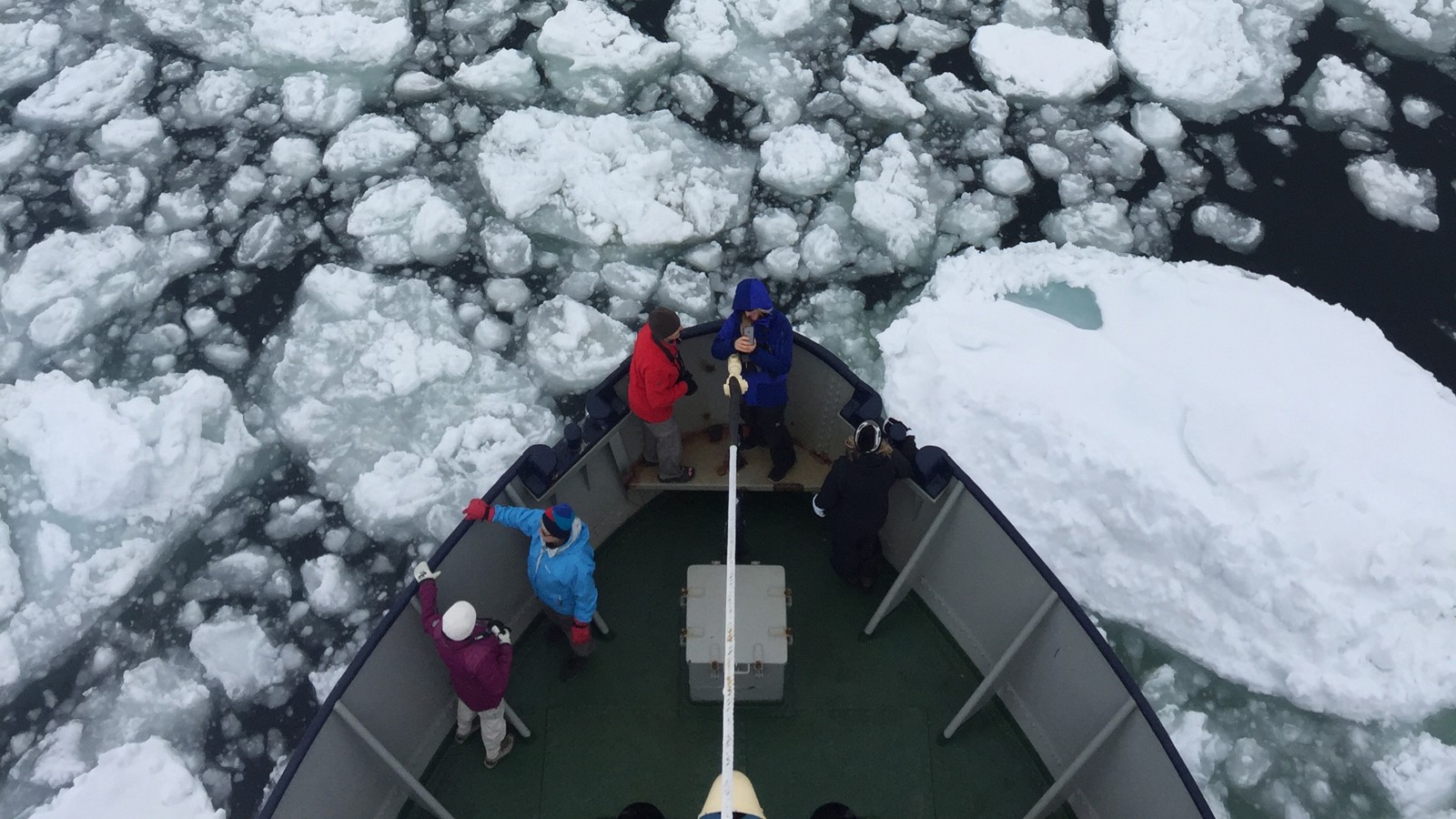 När vi vaknade denna morgon fann vi oss omringade av packis vid Svalbards södra ände – Sørkapp. Det var fascinerande att stå på däck och se fartyget plöja obehindrat genom ismassan. Adam klättrade upp i utkikstunnan vid 8:15 för att stanna där fram till 13:00. Här skulle spanas! Detta till synes livlösa landskap är hem till många arktiska djurarter som livnär sig på det rika havet inunder isen. Här spanade vi också efter isbjörnar på jakt efter de många sälar som syntes lite här och där.