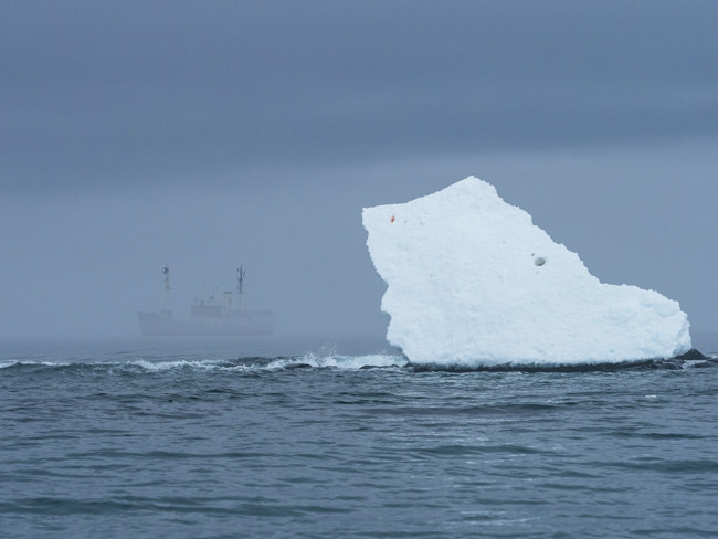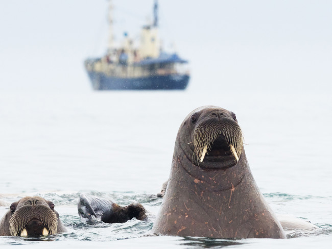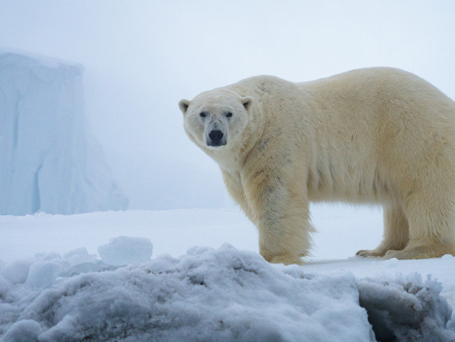 Vi hade nu ankommit till Kraemerpynten på Vitöns östra sida, nästa fastland i öster är Frans Josef Land i ryska Arktis. I den mystiska dimman spanade vi med handkikarens hjälp av den korta strandremsa som inte var täckt av Vitöns väldiga glaciärtäcke, och redan då kunde vi se en isbjörn. Kort efter frukosten klev vi i gummibåten och begav oss ut på en kryssning i sann expeditionsanda. Det dröjde inte länge förrän vi fick ett möte med en stor isbjörnshanne som nyfiken mötte våra blickar i det dimmiga landskapet. En stund senare lättade dimman på någon minut och det väldiga glaciärlandskapet omfamnade oss. På ett av isflaken framför glaciären låg en valrosshona och diande sin unge, ett högst ovanligt och vackert möte. Vi fick syn på fler isbjörnar när sikten förbättrades och tillslut kunde vi räkna till fem isbjörnar på denna östliga utpost!