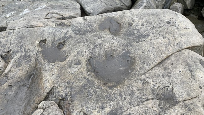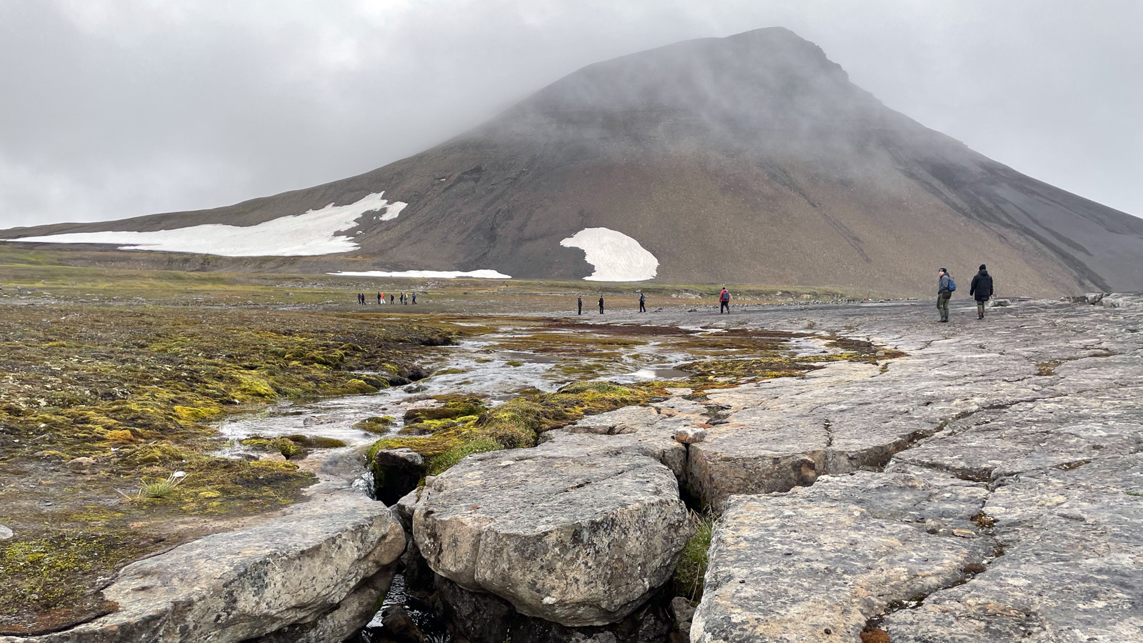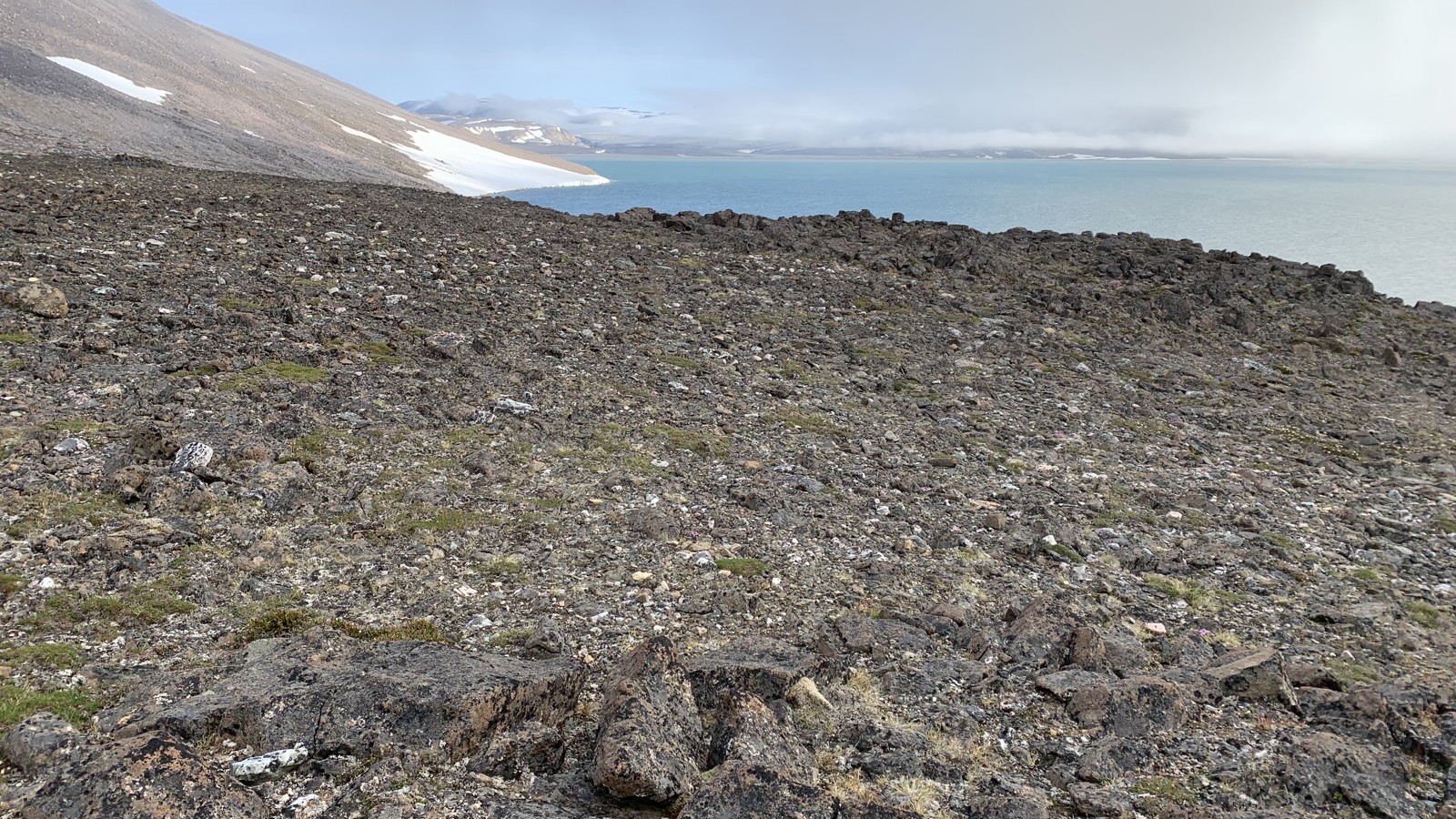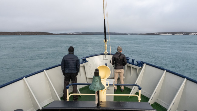 Utanför sundet är det dimmigt men när vi anländer till Boltudden på östra Spetsbergen så klarnar det och vi kan göra en landstigning. Vi vill gärna gå iland på udden därför att det har upptäckts fotavtryck från dinosaurier där. När vi landstiger så får vi leta en stund men till slut så hittar vi fotstegen. Det känns oerhört mäktigt att stå på en plats där djur från en helt annan tid rört sig och lämnat så tydliga spår.