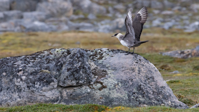 Vi fortsätter att gå upp på tundran och kommer till en liten smältvattendam där både smålom, skärsnäppa och ejder letar mat tillsammans med sina ungar. Till och med ett par kustlabbar häckar i närheten. När vi kommer tillbaka till M/S Stockholm bjuder kocken oss på en härlig middag som avlutning på den här fantastiska polardagen!