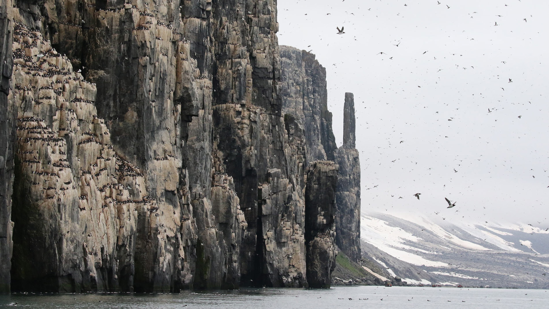 Den mäktiga fågelklippan Alkefjellet är under sommaren boplats åt hundratusentals spetsbergsgrisslor. På varje klipphylla av den branta basaltklippväggen kan du se häckande par vilket är en otrolig upplevelse. Ljuden och lukterna förstärker intrycken. Spetsbergsgrisslan bygger inga bon utan lägger sina ägg direkt på klipphyllan. Den tillhör familjen alkor och är en nära släkting till sillgrisslan. Spetsbergsgrisslan är en väldigt duktig dykare och kan dyka djupare än 100 meter. Med sin svartvita fjäderdräkt och sin upprätta hållning kan den på håll även liknas vid en pingvin, speciellt om du ser den sittandes på ett isflak.