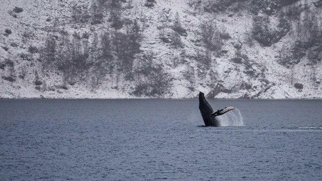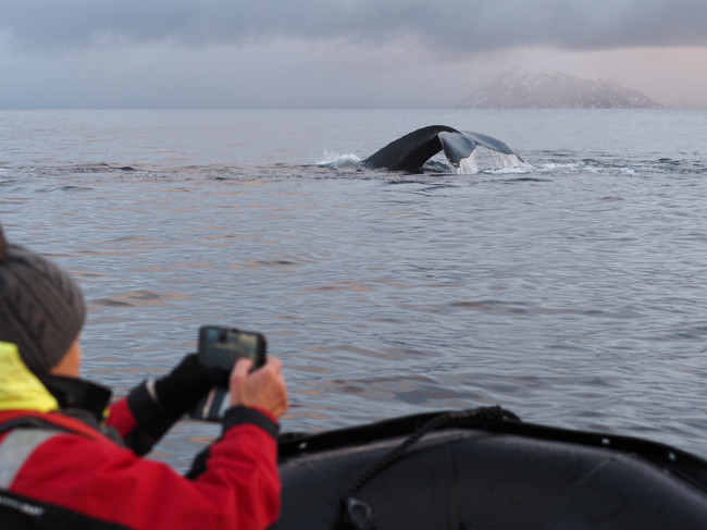 När vi seglade djupt in i Øksfjorden och närmade oss dess slut var landskapet fortfarande tomt. Vid vändpunkten, ungefär halvvägs tillbaka, övergick en känsla av förväntan till spänning när en serie blås äntligen syntes – knölvalar!