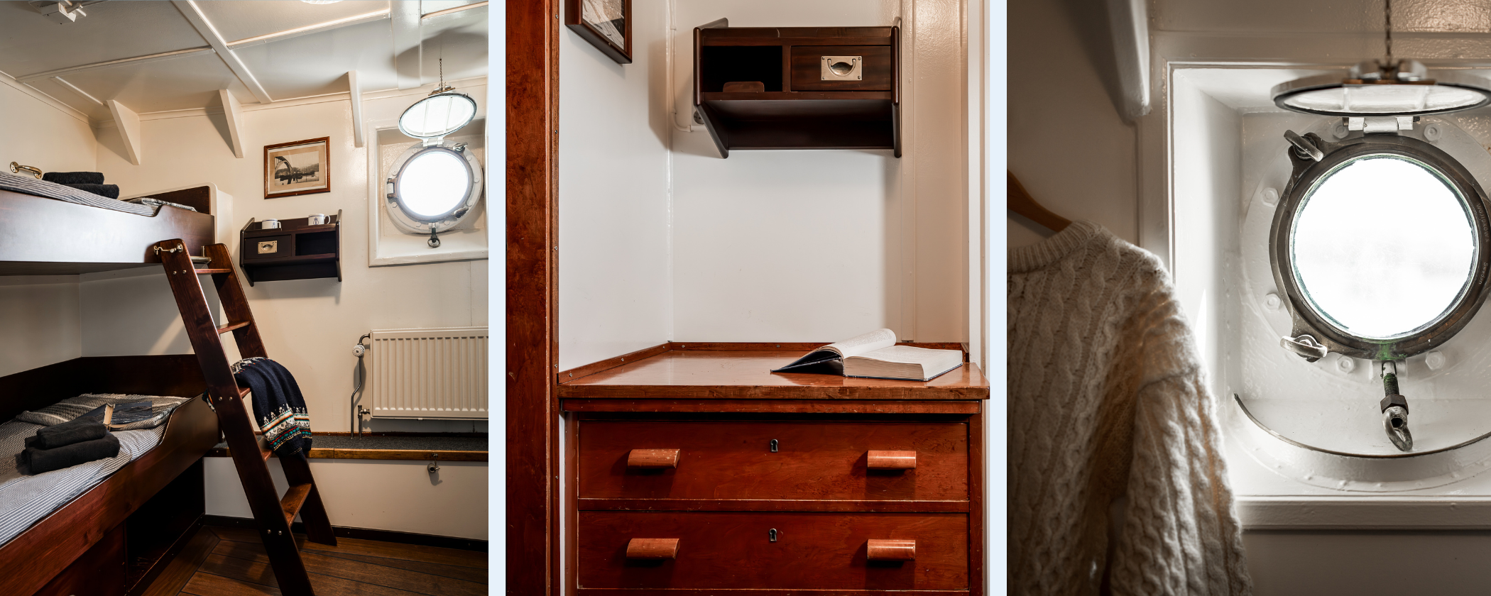 M/S Stockholm erbjuder sex dubbelhytter, alla med egna badrum, våningssängar och små ventiler. Hytterna är enkelt men bekvämt inredda och erbjuder allt du behöver för en trivsam vistelse till sjöss. Efter en dag av arktiska upplevelser blir din hytt en rofylld tillflyktsplats där fartygets mjuka ljud och havets stilla rörelser vaggar dig till sömns.