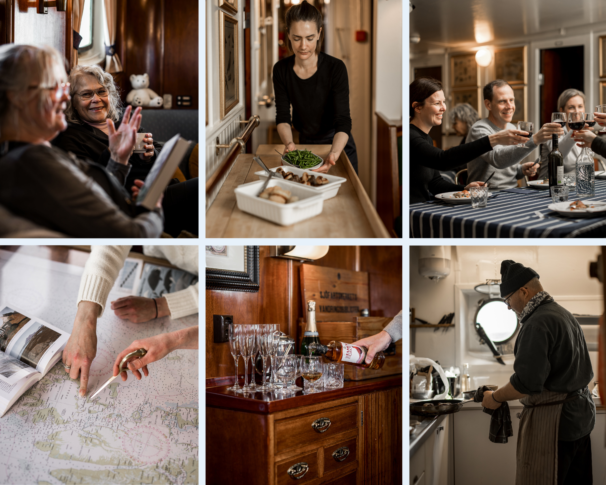 I den hemtrevliga matsalen kan du njuta av utsökta måltider och samtidigt samtala om dagens upplevelser med dina medresenärer. I salongen kan du koppla av med en kaffe eller en drink och beundra de storslagna omgivningarna. Maten ombord håller hög kvalitet och all dryck ingår i resans pris. Stämningen är informell och varm och ger mer känslan av att vara hemma hos någon än ombord på ett expeditionsfartyg. Bryggan är öppen för besökare och välkomnar dig att titta in till kapten eller bara njuta av landskapet medan fartyget navigerar genom de isiga vattnen.
