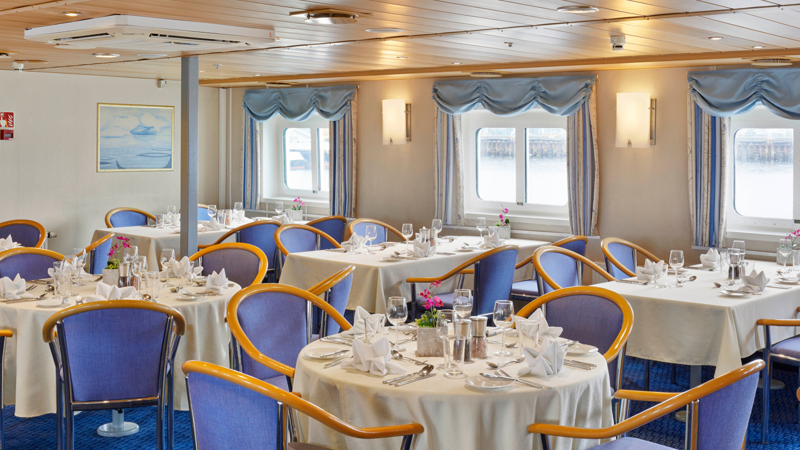 I fartygets matsal serveras härliga måltider mellan landstigningarna och i panoramaloungen har man en vidunderlig utsikt över det omgivande polarlandskapet. Här kan man lyssna till intressanta föreläsningar om områdets biologi och polarhistoria.