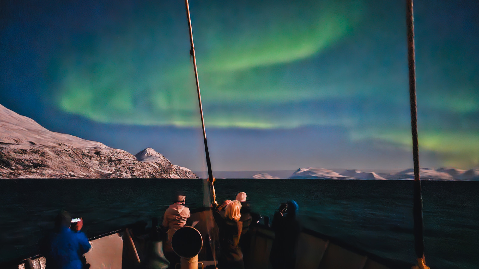 Det var vår sista dag på M/S Stockholm i Nordnorge. Vi hade just en landstigit i Finnkroken och klockan var halv fem när himlen plötsligt började lysa. Ett ord… Norrsken! Det dansade över himlavalvet och blev allt starkare, tills det nådde sin topp vid klockan sex. Himlen fullkomligt exploderade! Nyanser av intensivt grönt ersattes av rött, rosa och lila. Färger så intensiva att det ibland blev till en vit varm strimma som skimrade över hela himlen. Moder natur belönar den som är tålmodig och vi fick ett sista hurra av färgexplosion på himlen.