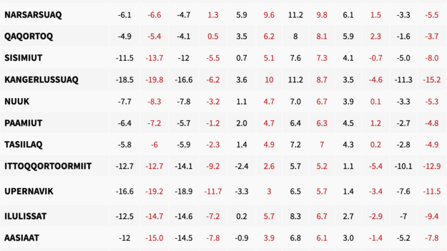 Tänk på att köldfaktorn, som även räknar in vindhastighet och luftfuktighet, kan göra att vi upplever vissa dagar kallare än vad termometern faktiskt visar. Informationen ovan och tabellen nedan (på medeltemperaturer) är hämtade från Visit Greenlands hemsida, där ni även finner mer detaljer om väder. Medeltemperaturen i tabellen är för dygnet, ni kan således förvänta er några grader högre under dagtid och några grader lägre under natten.