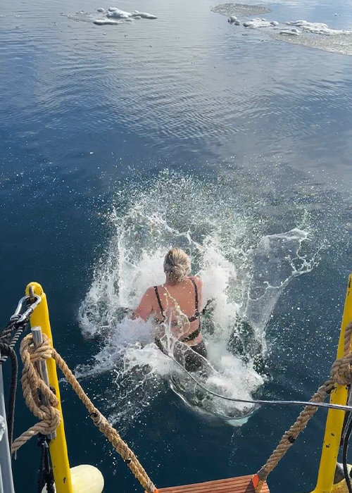 Förutsättningarna för mitt polardopp på Svalbard kunde inte vara bättre. Solen sken och vi hade utsikt över snöklädda berg och isflak på spegelblankt vatten. Besättningen gjorde sitt bästa för att peppa med musik och hejaropp. Det går av bara farten, och plötsligt finns det ingen återvändo. 'Uppfriskande' är milt uttryckt, men känslan efteråt gör det hela värt det.