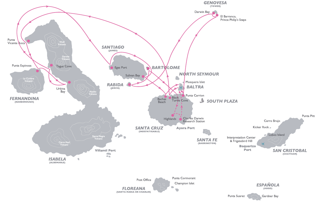 Vänligen notera: Detta är endast en preliminär färdplan. Vår exakta rutt beror på Galapagos myndigheter och kan eventuellt komma att ändras.