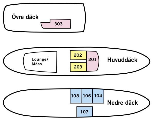 Vi erbjuder alltid möjligheten att boka del i dubbelhytt med ventiler på M/S Sjøveien då många av våra kunder reser på egen hand. Hytterna delas alltid upp i damhytter och herrhytter.