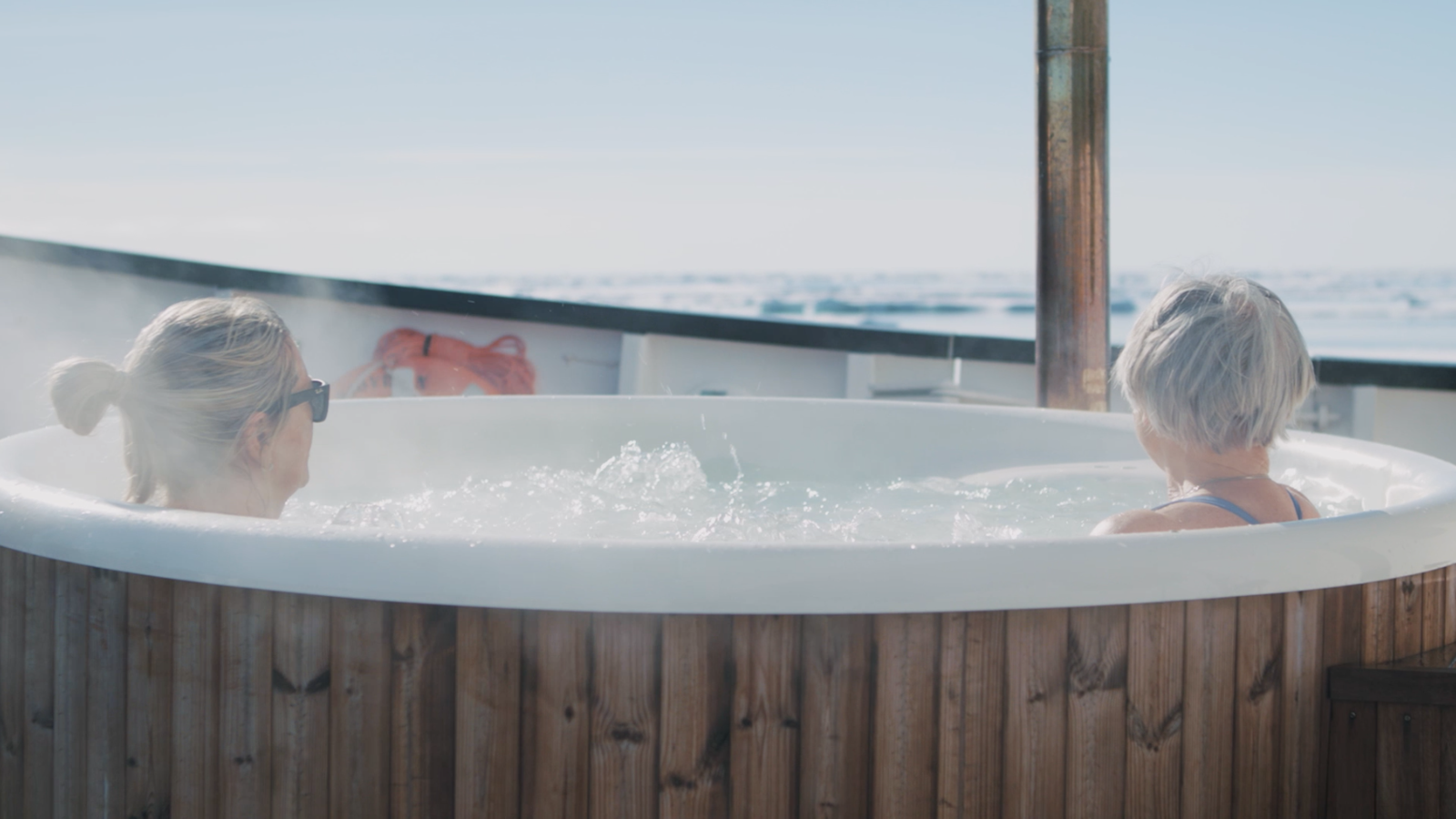 Bryggan är alltid öppen för besök och ovanpå denna finns ytterligare ett däckutrymme, varifrån vi har fantastisk utsikt över det omgivande polarlandskapet. Ute på däck finns det även en vedeldad badtunna. Fartyget tar 12 passagerare i åtta hytter, alla med privata faciliteter. På M/S Sjøveien finns det två gummibåtar och två svensk- och engelsktalande guider.